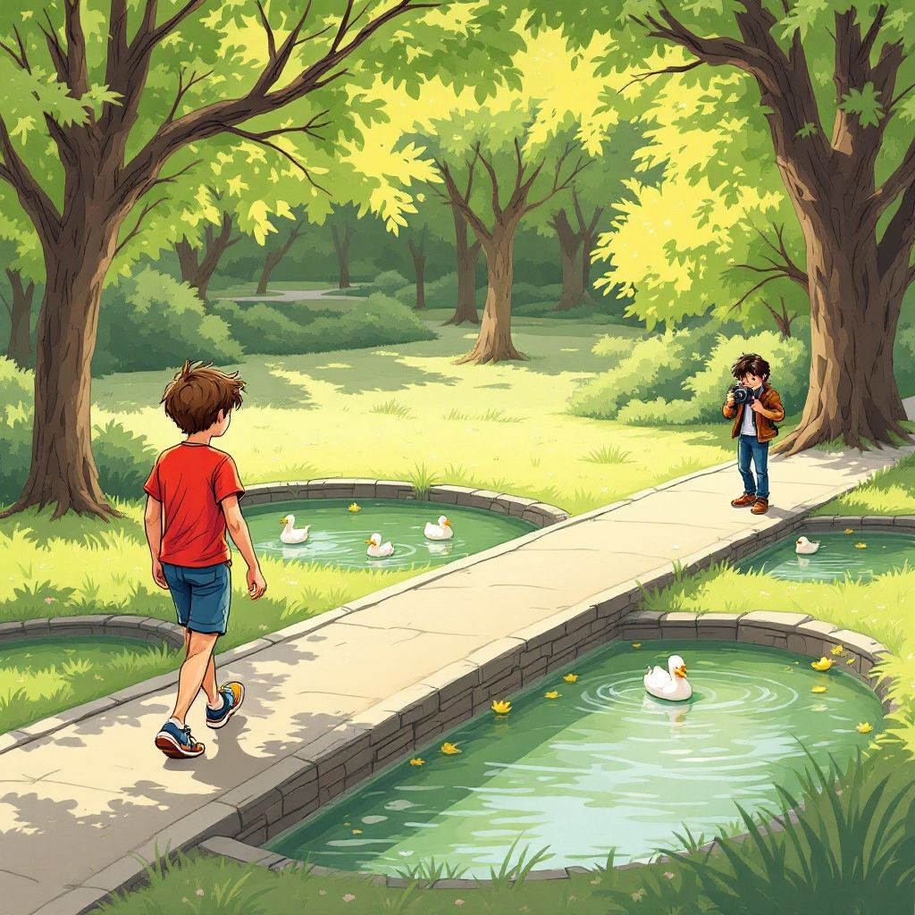 Next, they strolled through Central Park. [Emory](LKHLQJZS) loved feeling the green grass beneath his feet, while [Jasper](R4BQBM7P) snapped photos of the peaceful ponds and lush trees. They even spotted some ducks swimming by.