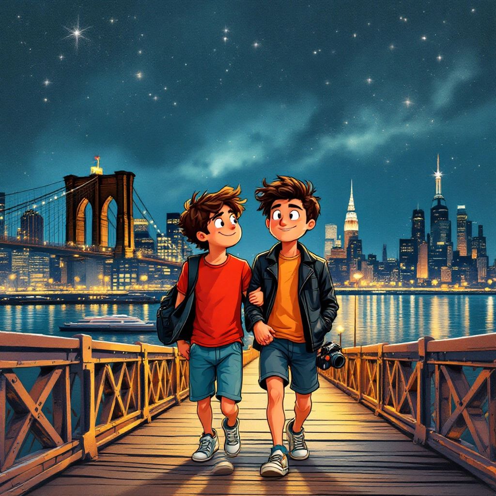 As night fell, they took a walk along the Brooklyn Bridge. The twinkling lights of the city reflected on the water, and they could hear the distant hum of nightlife. [Jasper](R4BQBM7P) captured one last picture of the city's glowing silhouette.