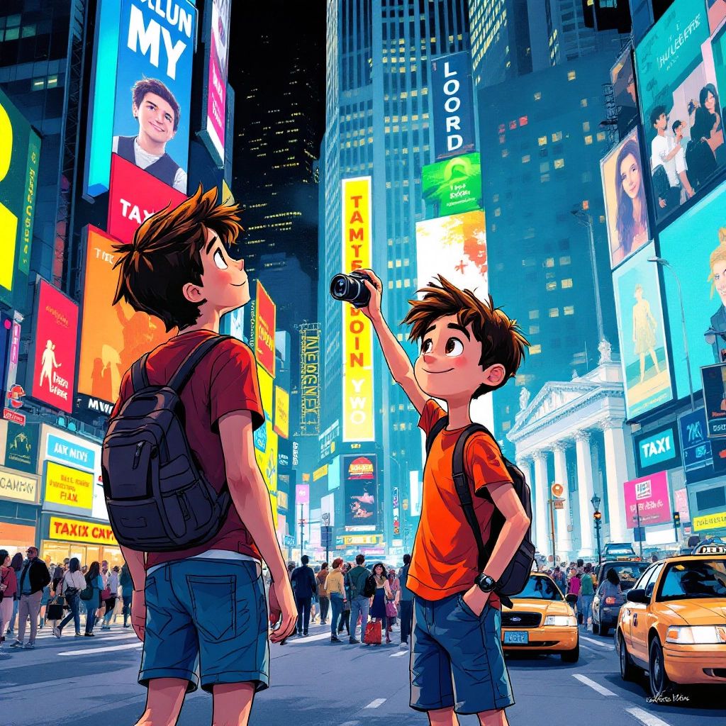 Their first stop was the iconic Times Square. [Jasper](R4BQBM7P) couldn't stop clicking his camera, capturing the sea of people, towering billboards, and brilliant neon lights. [Emory](LKHLQJZS) was thrilled, taking in the energetic atmosphere.