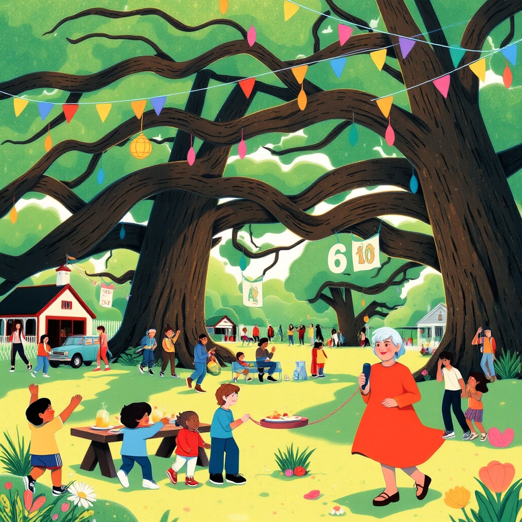 The townspeople gathered in the majestic Oakwood Park to prepare for [Jayne](3F5C5Y29)’s birthday bash. Balloons of every color painted the trees, and long picnic tables were covered in confetti and delicious snacks.