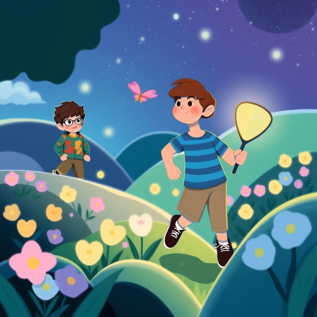 Next, the shoes whisked [Jeremy](J4MGFTDP) into another dream—this time, it belonged to [Leo](BMCK9BJC), the boy who always sat quietly at recess. [Leo](BMCK9BJC) was chasing a butterfly but couldn’t seem to catch it.