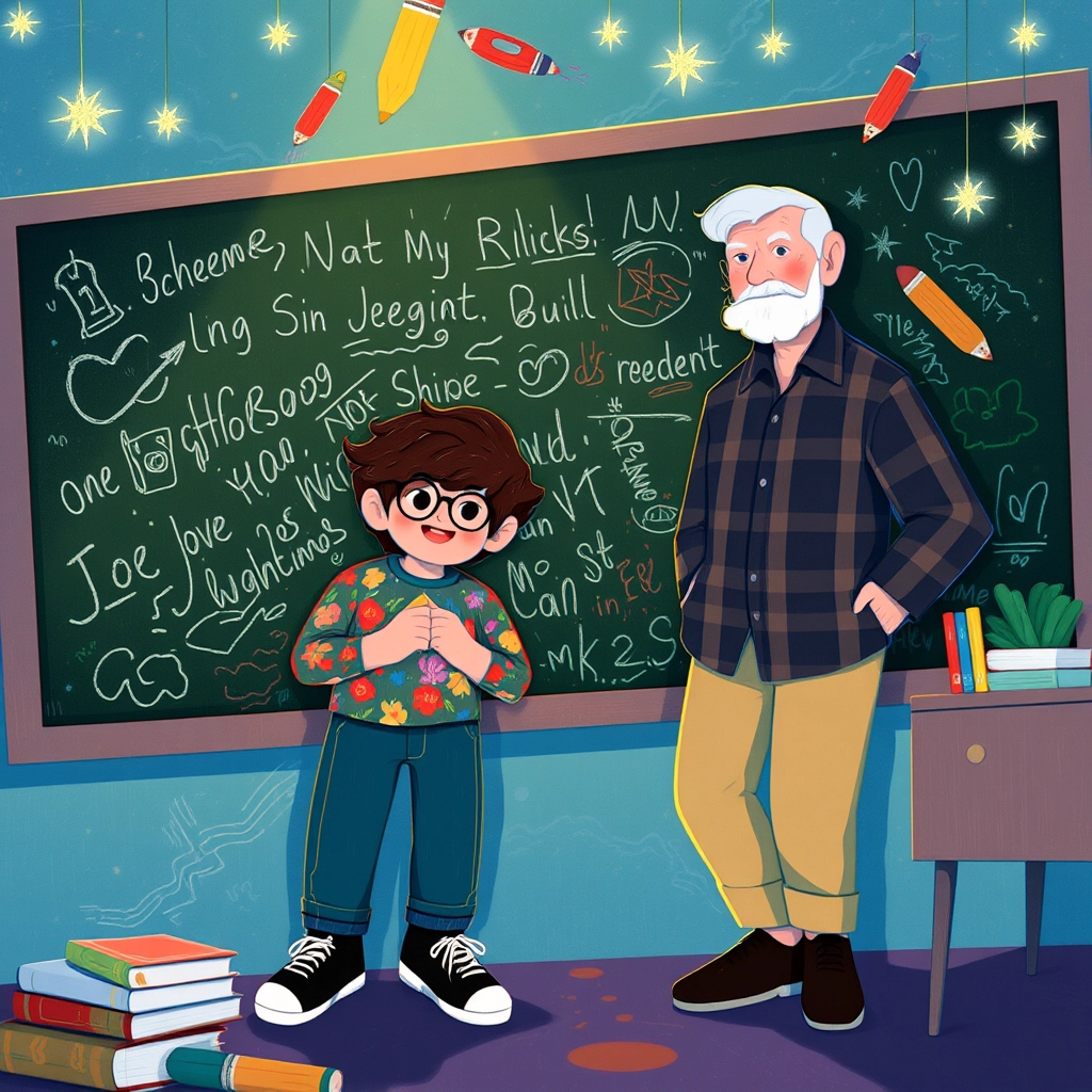 The shoes then took [Jeremy](J4MGFTDP) to his final dream, where he saw [Mr. Thompson](BMSP7C6D), the kind janitor from school. [Mr. Thompson](BMSP7C6D) was struggling to clean a giant chalkboard while students laughed behind him.