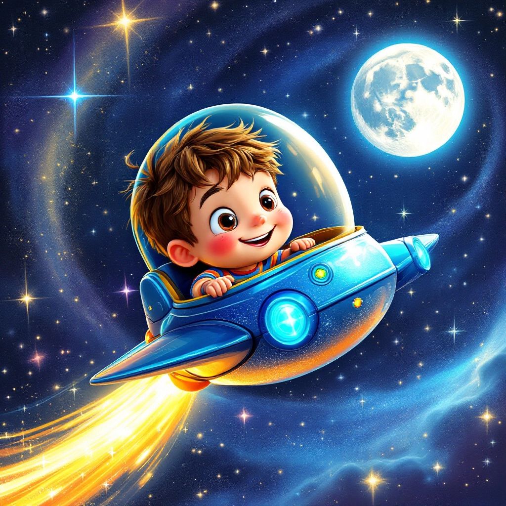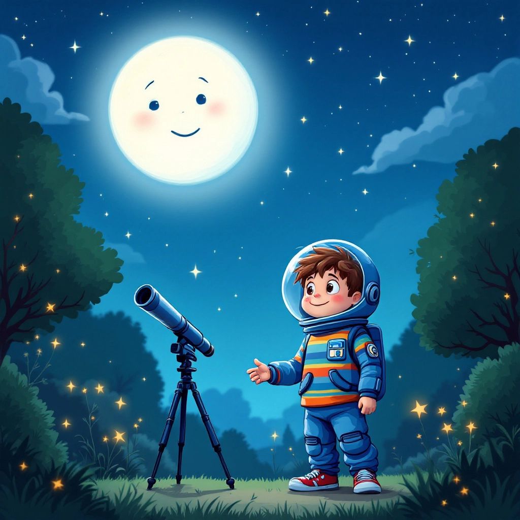 [Jimmy](QK7PD5K3) was no ordinary 5-year-old. He loved rockets, stars, and dreaming about outer space. One night, as he looked through his telescope, he said, 'I wish I could visit the Moon!' Suddenly, he heard a funny whirring sound behind him...