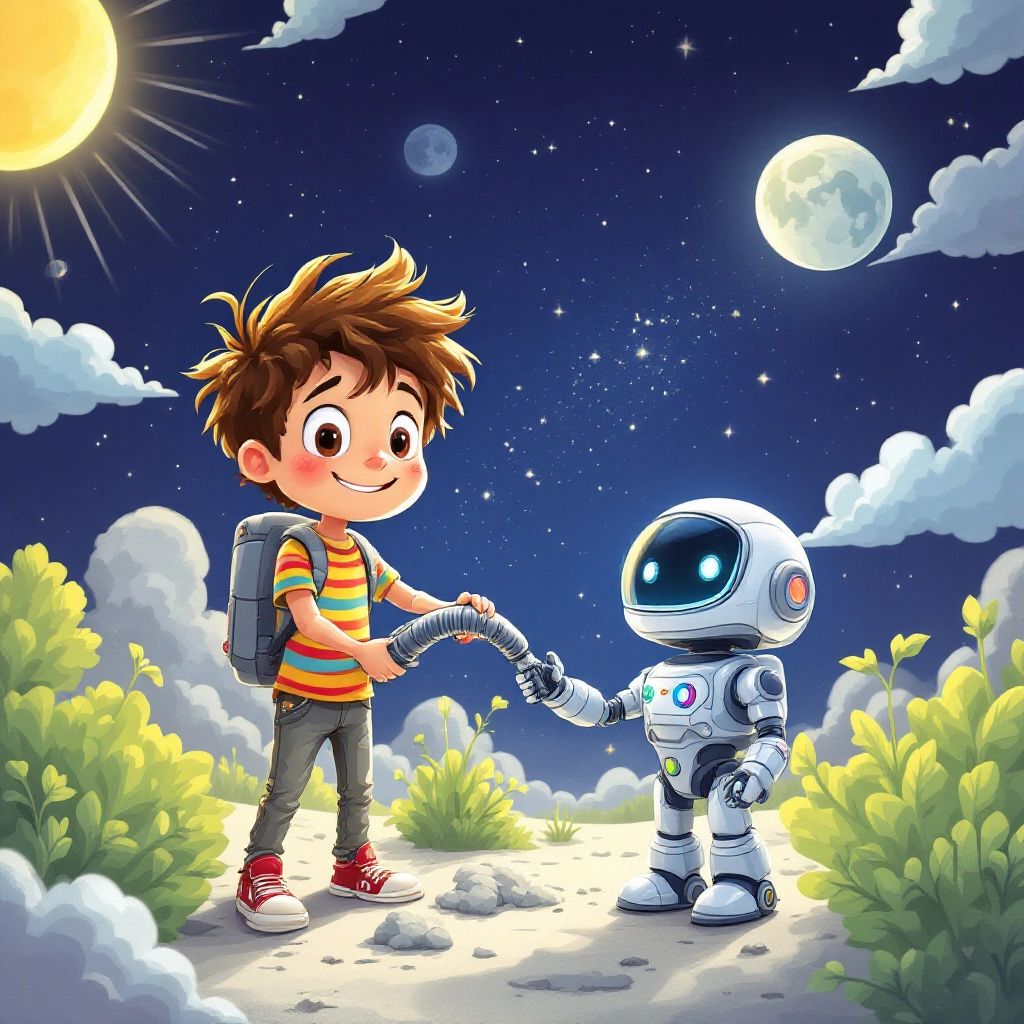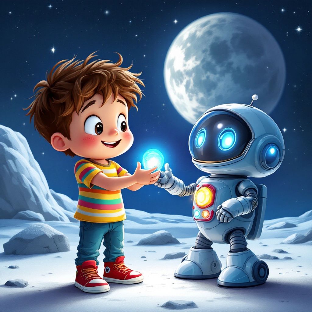 'Whoosh!' A tiny rocket robot named [Astro](GYSPLC7H) popped into the room. 'Hi, [Jimmy](QK7PD5K3)! I'm here to help make your Moon wish come true!' [Jimmy](QK7PD5K3) stared wide-eyed as [Astro](GYSPLC7H) unfolded into a sparkly, magical spaceship big enough for both of them.
