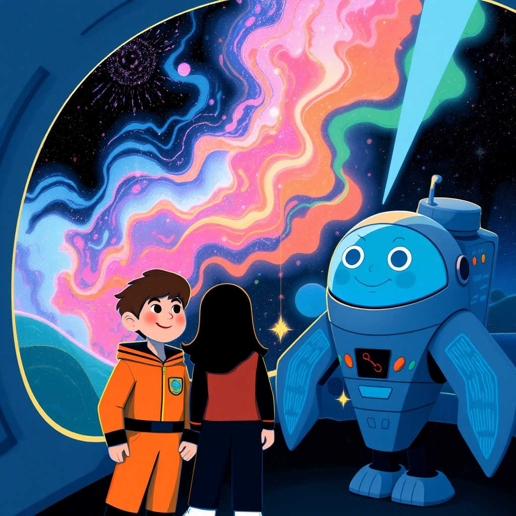 For their final stop, [Astro-10](25JX2QZR) showed them a magnificent nebula, sparkling in rainbow colors. [Greta](79L72B77) called it the 'Galaxy’s Greatest Painting.'