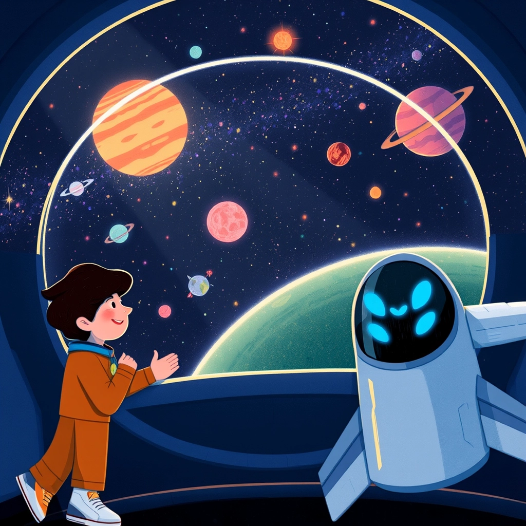 [Astro-10](25JX2QZR) took them into space, zooming past twinkling stars and colorful planets. [Joe](SG7M9Y6Z) and [Greta](79L72B77) couldn’t stop smiling as they looked out of the giant windows.