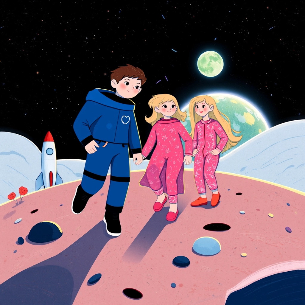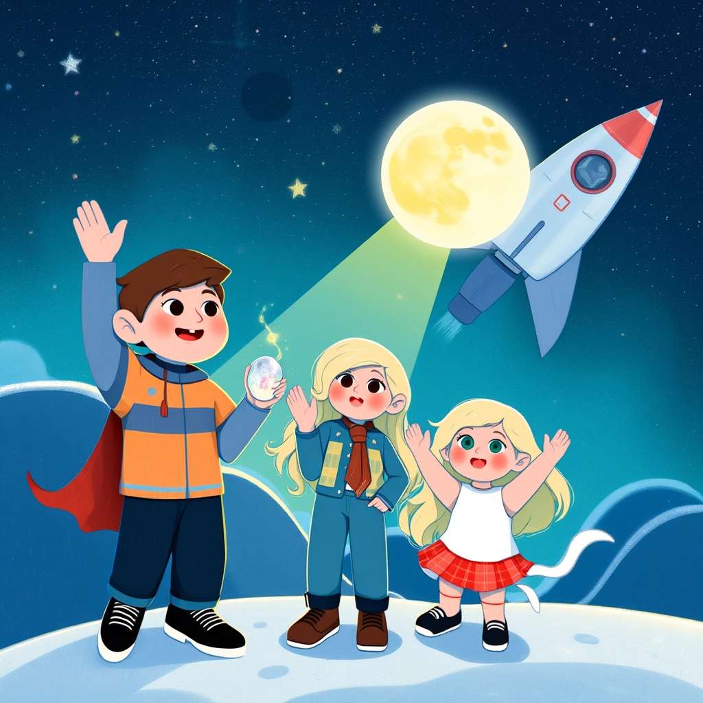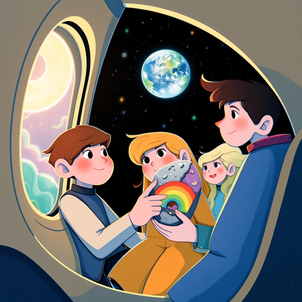 As the rocket soared back to Earth, [Sarah](594QYKYV) held the sparkling rainbow rock and smiled. ‘The moon is magical, isn’t it, [Joe](SG7M9Y6Z)?’ she asked. [Joe](SG7M9Y6Z) nodded, feeling proud.