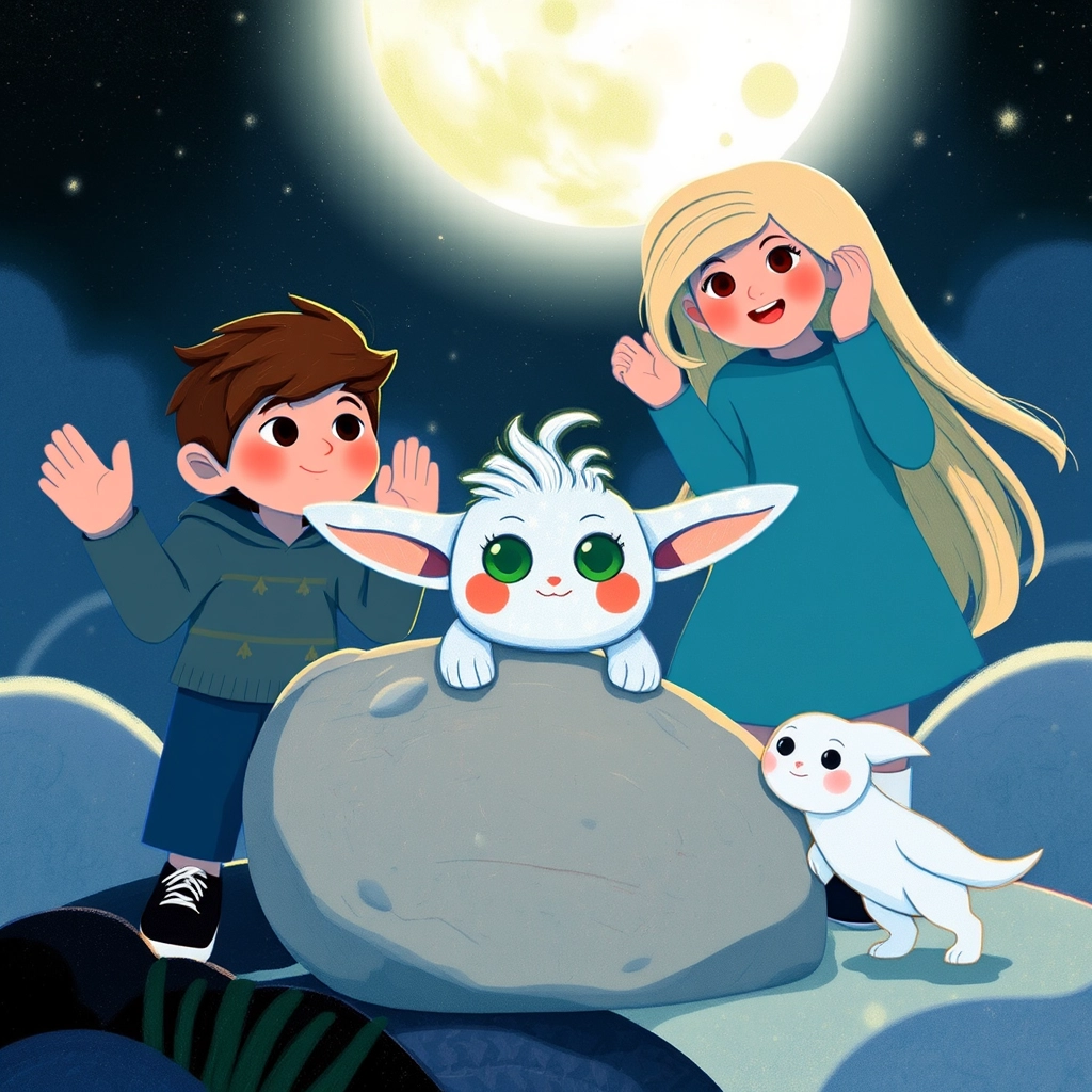 "[Joe](SG7M9Y6Z), look!" [Sarah](594QYKYV) exclaimed, pointing at a tiny moon creature with glowing green eyes and silver fur peeking out from behind a rock. "It’s so cute!"
