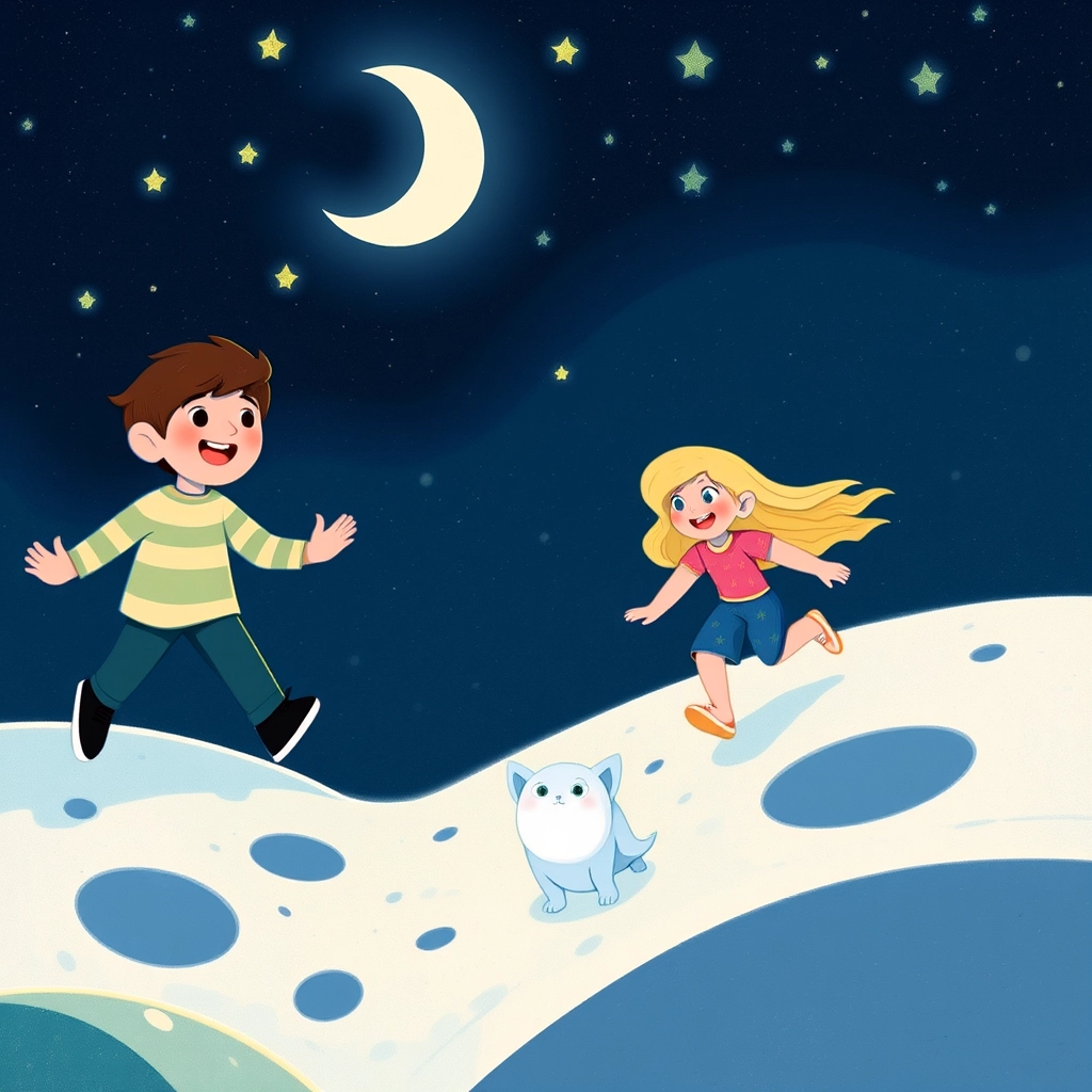 The moon creature waved back, making beeping sounds. ‘It wants to play!’ [Sarah](594QYKYV) cheered. [Joe](SG7M9Y6Z) grinned and they played a game of space tag!