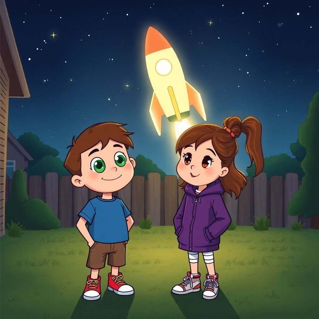 When they landed back on Earth, the rocket said goodbye and disappeared into the stars. [Joe](K24VHHYP) grinned, 'Best night ever!' [Stacy](47M43QKC) agreed, 'Let’s keep looking up!'