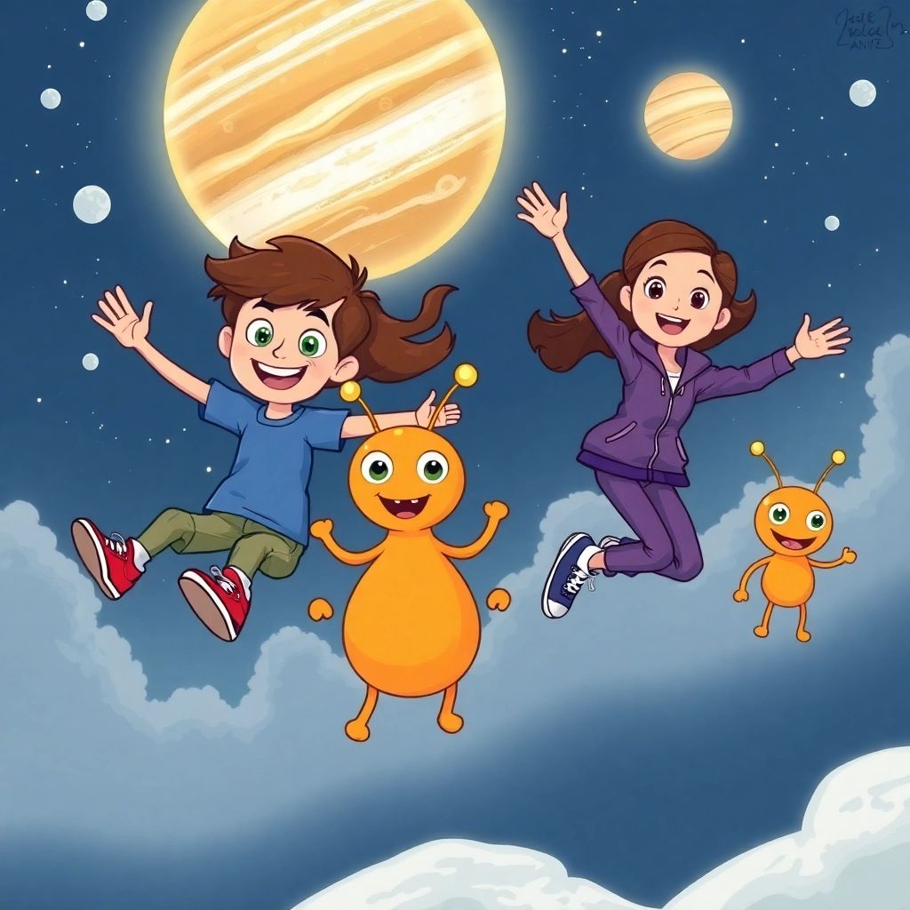 [Joe](K24VHHYP) and [Stacy](47M43QKC) laughed as they bounced across the low-gravity moon with [Flibber](3YHMVY4X). 'Woohoo! This is like a trampoline!' [Joe](K24VHHYP) shouted.