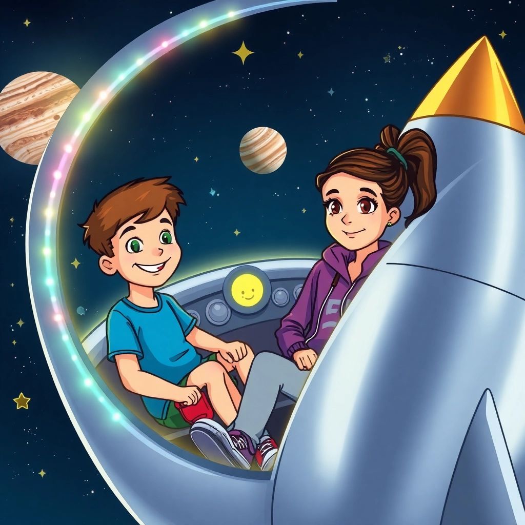[Luna](C9JNGFKP) threw the lever, and WHOOOSH! They zoomed past shining stars, swirling comets, and meteor showers. [Joe](K24VHHYP) cheered, 'This is AWESOME!'