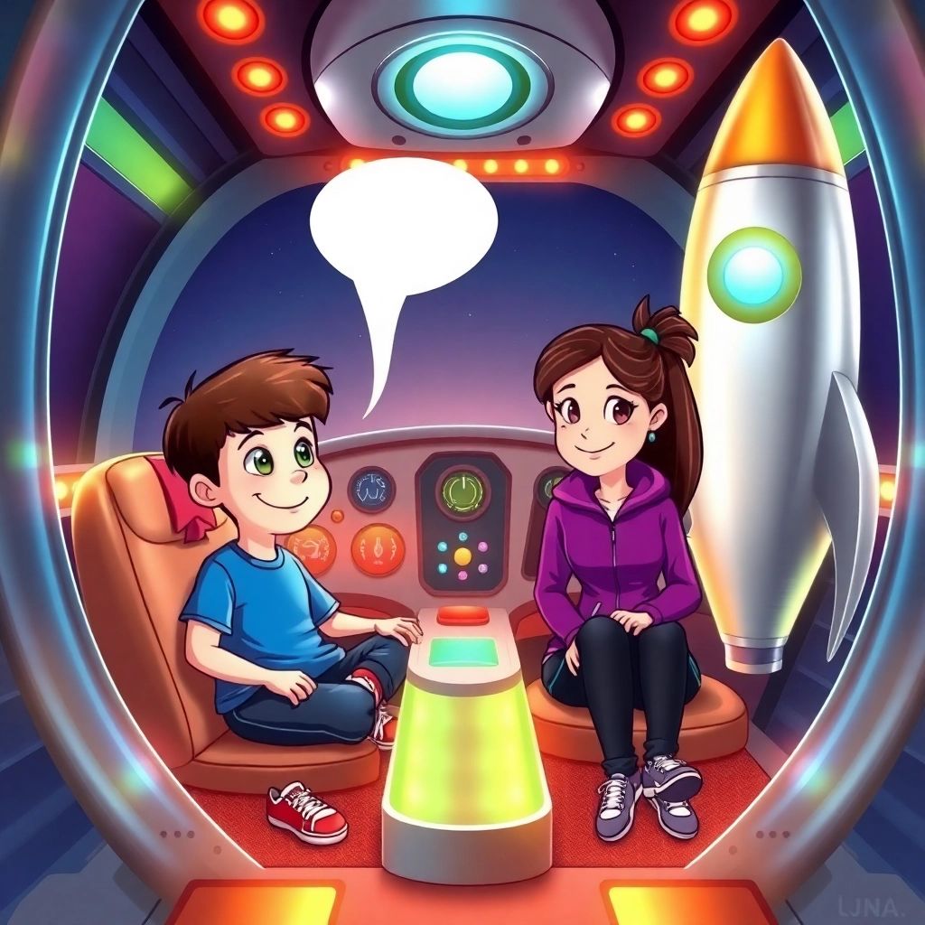 The rocket spoke in a humming voice, 'I’m [Luna](C9JNGFKP) the Explorer! Want to see space?' [Joe](K24VHHYP) and [Stacy](47M43QKC)’s eyes sparkled as they climbed aboard.