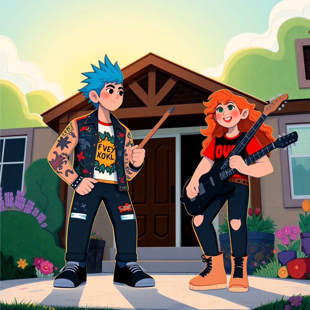 One day, [Johnny](TL9B4T6S) decided enough was enough. He grabbed his drumsticks and promised to find a way to beat the [Anxiety Vampires](Q7JJVLTF). As he walked out of the house, he was greeted by his best friend, [Bella](YQC2W64R) the bassist, and her sunny smile. 'Let’s jam, [Johnny](TL9B4T6S)!'