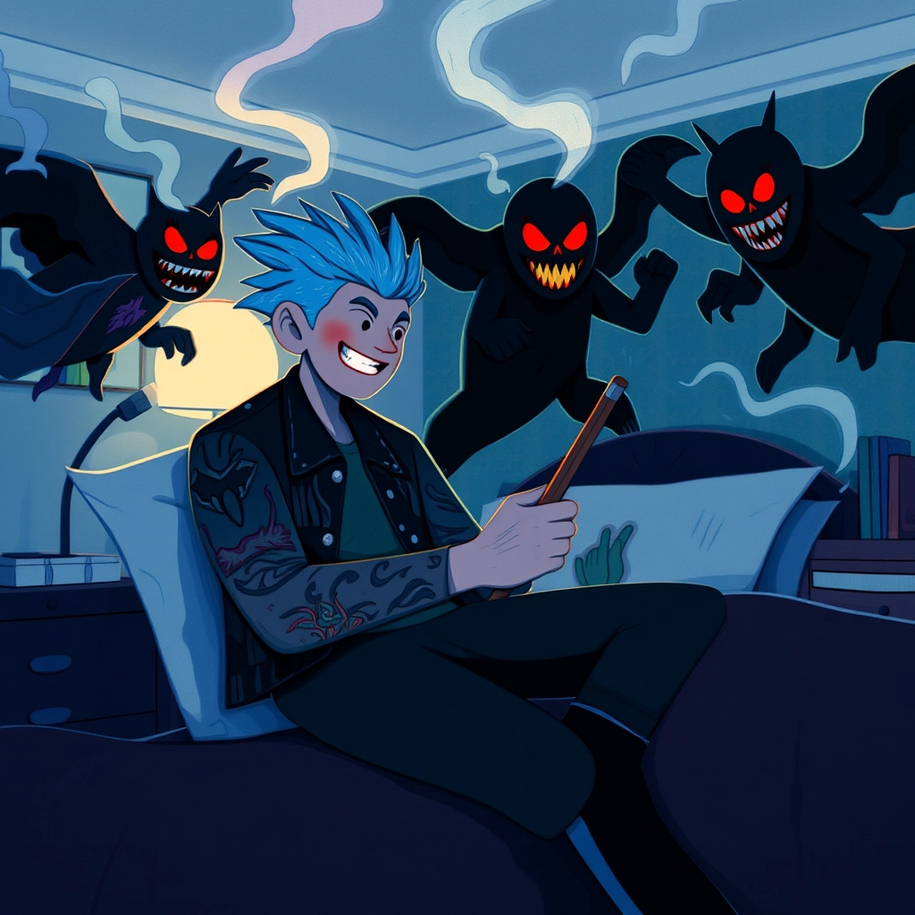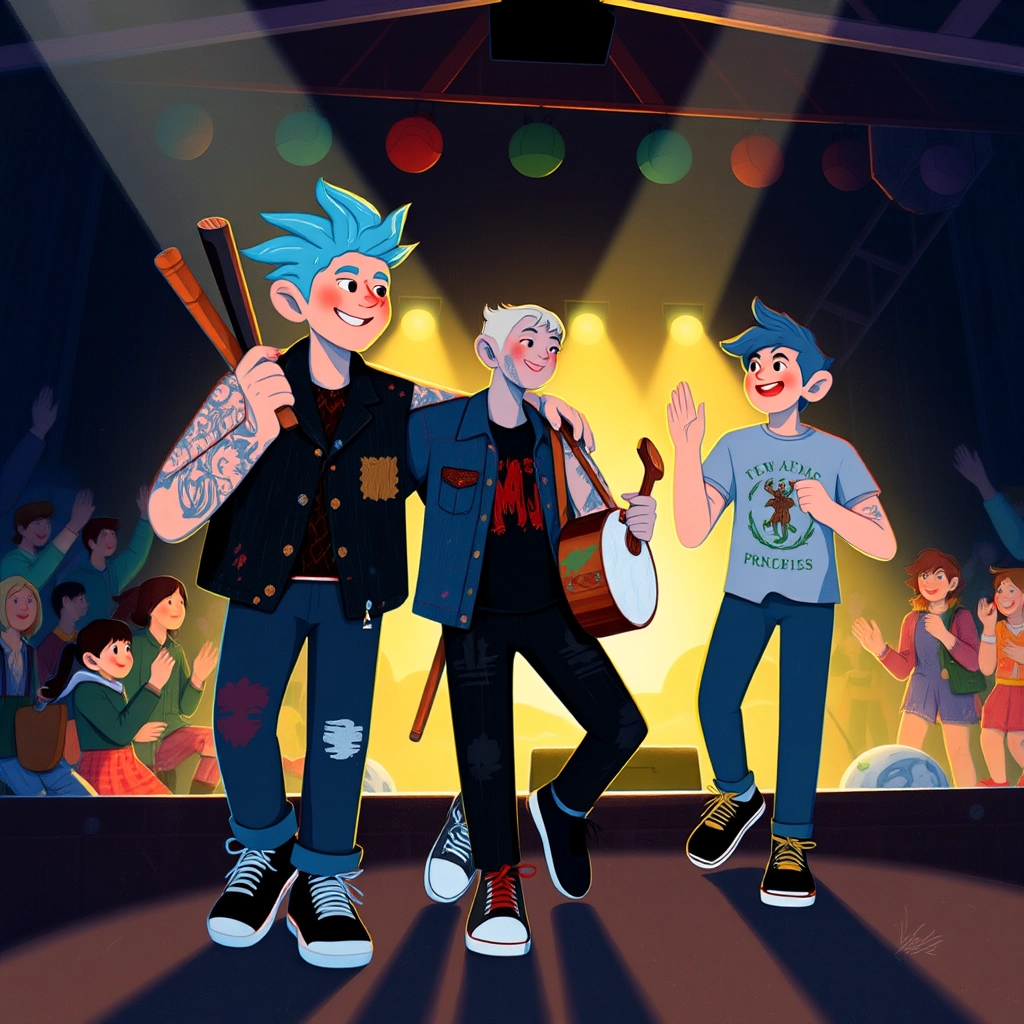 [Johnny](TL9B4T6S) loved playing drums more than anything. His blue mohawk and punk denim outfit were as iconic as the fierce beats he loved to play. But every time he thought of performing on stage, the [Anxiety Vampires](Q7JJVLTF) came creeping, whispering doubts and fears. Tonight, sitting alone in his room filled with posters of famous punk bands, [Johnny](TL9B4T6S) tapped nervously on his drumsticks.