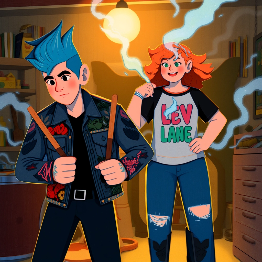 They headed to their favorite garage-turned-music studio. Every corner of the room was packed with amplifiers, instruments, and punk band posters on the walls. [Johnny](TL9B4T6S) began drumming with [Bella](YQC2W64R) on bass. As the music grew louder, the [Anxiety Vampires](Q7JJVLTF) began to flicker and fade!