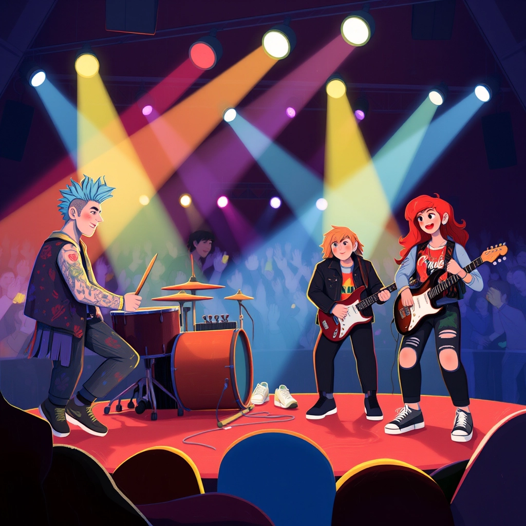 The day of their first gig arrived. [Johnny](TL9B4T6S) was nervous, but [Bella](YQC2W64R) and their bandmates—[Mark](2Q66KB7N) the guitarist and [Lucy](WVMY3VQV) the singer—cheered him on. The crowd chanted their name, and [Johnny](TL9B4T6S) took a deep breath as the stage lights illuminated the band.