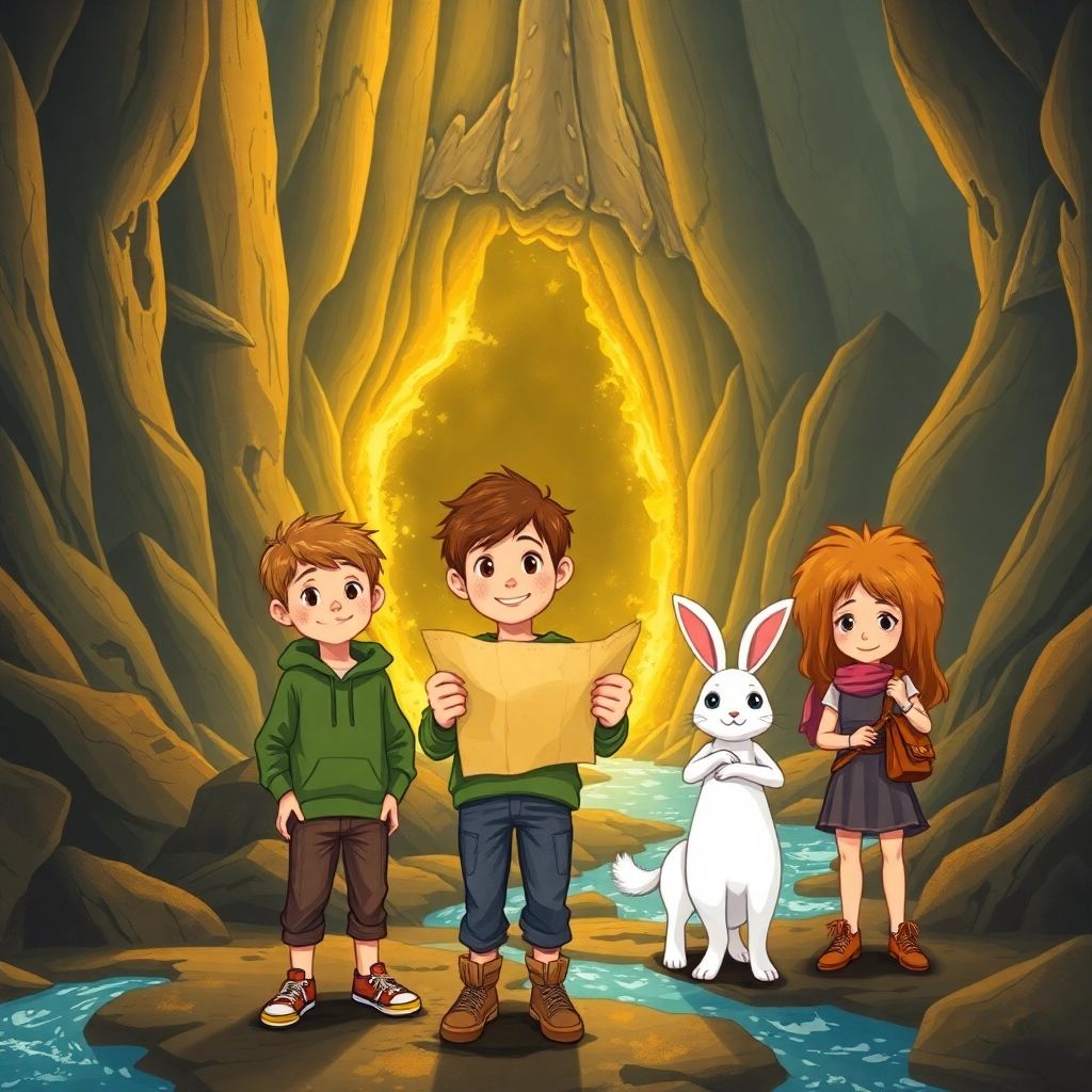 Guided by the map, the team solved riddles, crossed a shimmering river on floating rocks, and climbed a mountain whose peaks brushed the clouds. At last, they arrived at the Cave of Echoes, where the stone was said to be hidden.