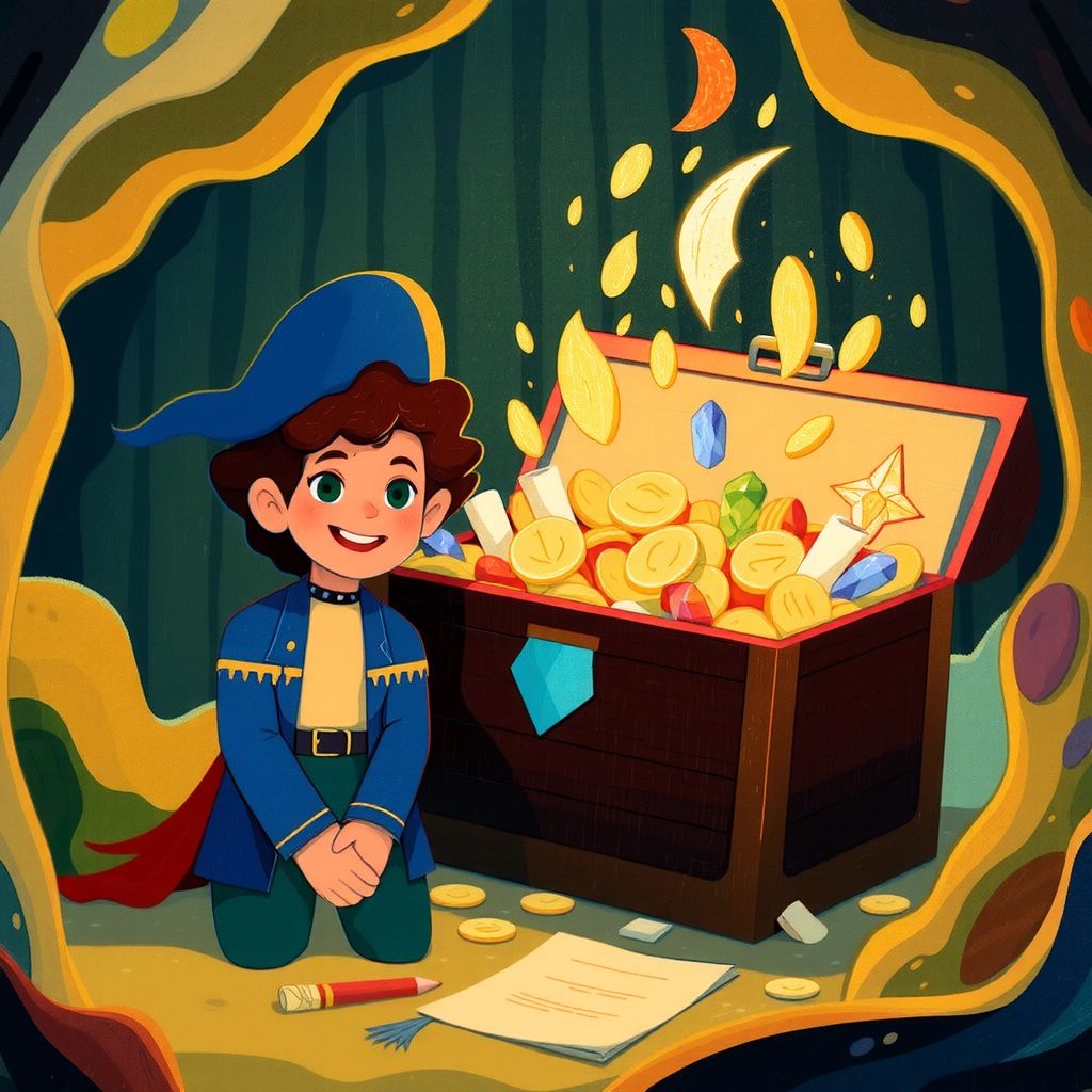 With jubilant excitement, [Joseph](SGFRGNJB) uncovered the Pirate King's treasure—a dazzling display of gold, jewels, and ancient scrolls. He felt the warmth of adventure and friendship, the true treasures of the heart.