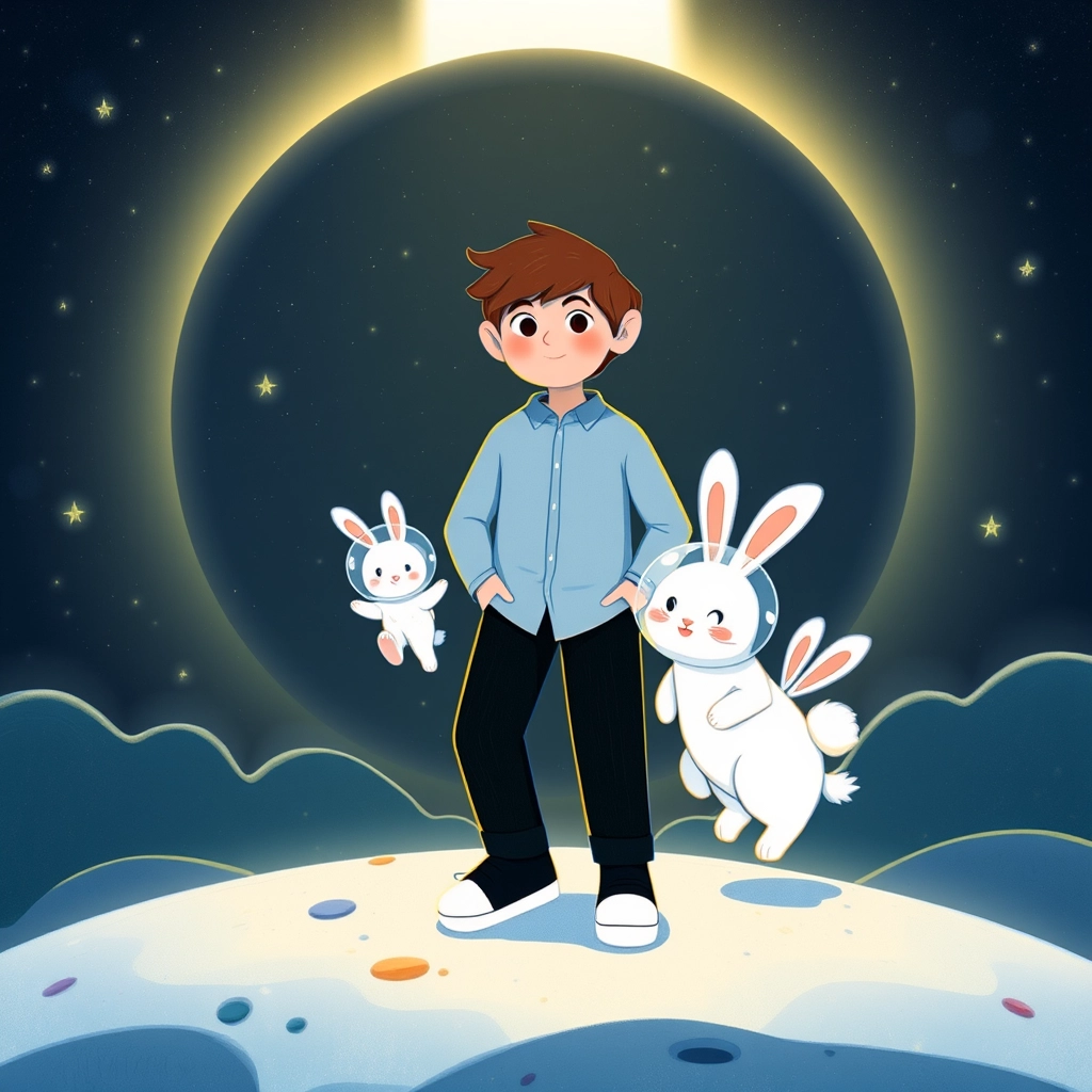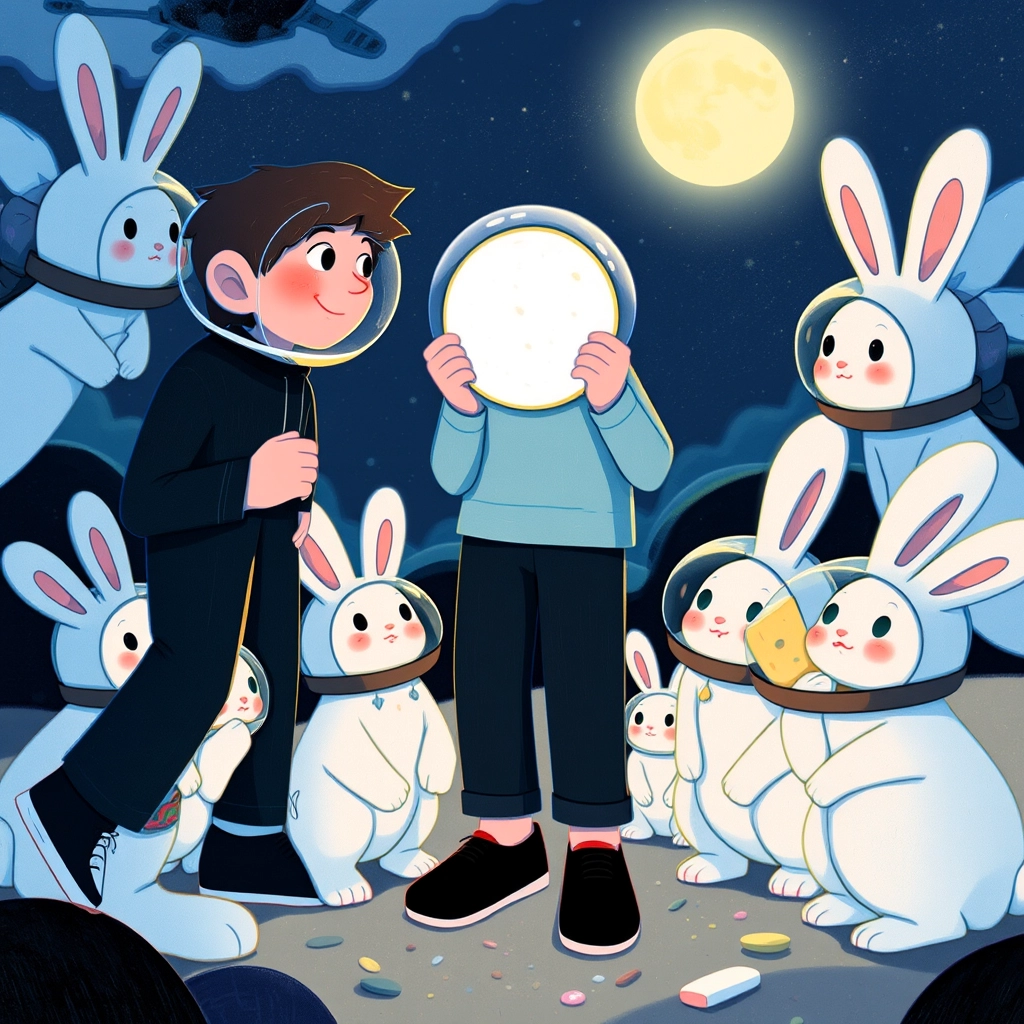 When he reached the moon, he was greeted by a group of friendly moon bunnies who wore space helmets and bounced around happily.