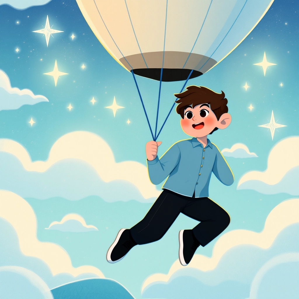 [Joshua](CYF7L3PB) smiled wide. 'Yes!' He grabbed the string, and WHOOSH! The balloon lifted him gently into the sky. Up past the clouds, stars twinkled around him like glitter.