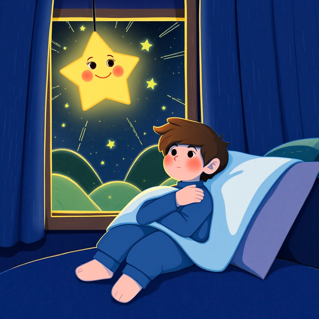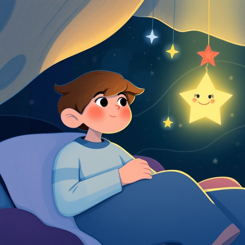 One evening, [Joshua](6L7YWDMC)'s room felt darker than usual. His little night light, shaped like a cheerful star, had gone out. 'Oh no,' [Joshua](6L7YWDMC) whispered, his heart beating fast. He hugged his blue blanket tightly, feeling a little scared.