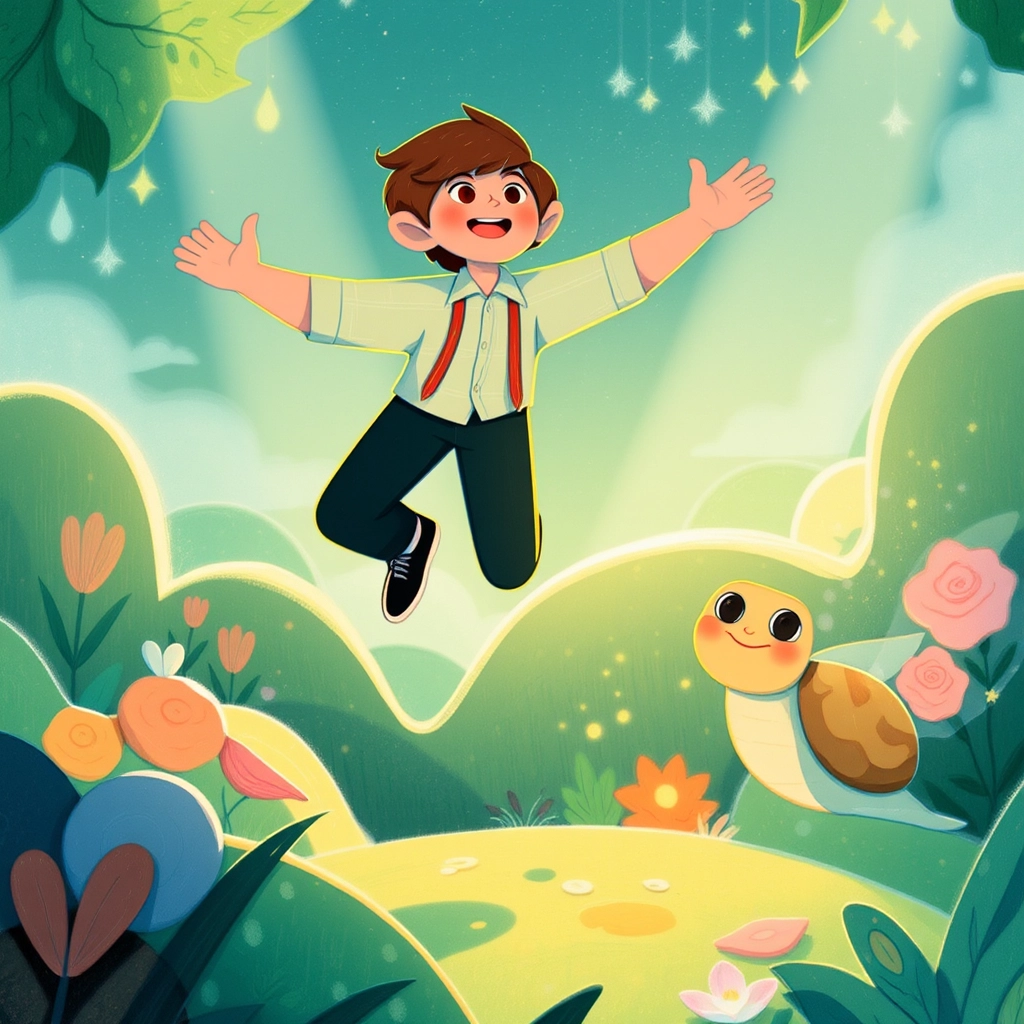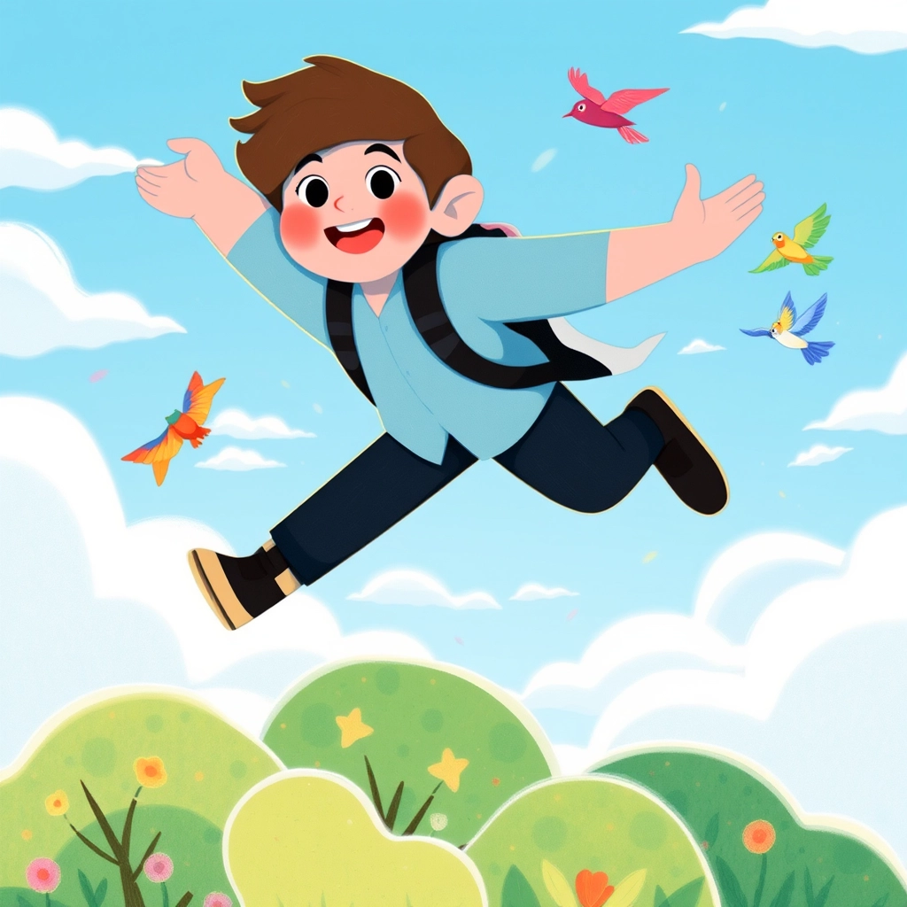 [Joshua](CYF7L3PB) flew over trees, waved at birds, and even touched a fluffy cloud before landing back in the garden.