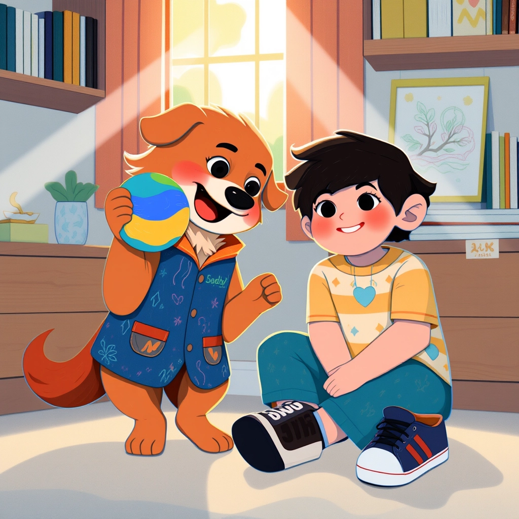 One sunny morning, [Joy](LGKKDMY5) noticed [Aryash](Y29KFJTX) looking sad. [Aryash](Y29KFJTX) was having a tough day getting started. [Joy](LGKKDMY5) knew exactly what to do. He brought [Aryash](Y29KFJTX)’s favorite sneakers and a ball to cheer him up.