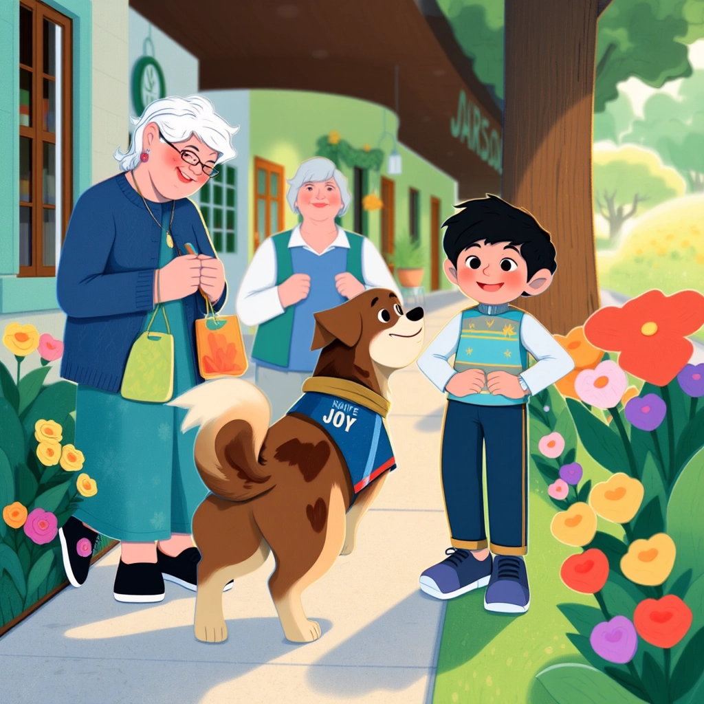 Once upon a time, in a cozy little town, there lived a two-year-old service dog named [Joy](LGKKDMY5). [Joy](LGKKDMY5) had fluffy brown and golden fur and wore a shiny blue service vest. He loved wagging his tail and was always ready for new adventures.