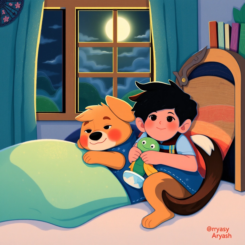 [Aryash](Y29KFJTX) whispered softly, ‘Thank you for taking care of me, [Joy](LGKKDMY5).’ [Joy](LGKKDMY5) wagged his tail quietly, knowing he had done his job. And so, they fell asleep—safe, happy, and together.