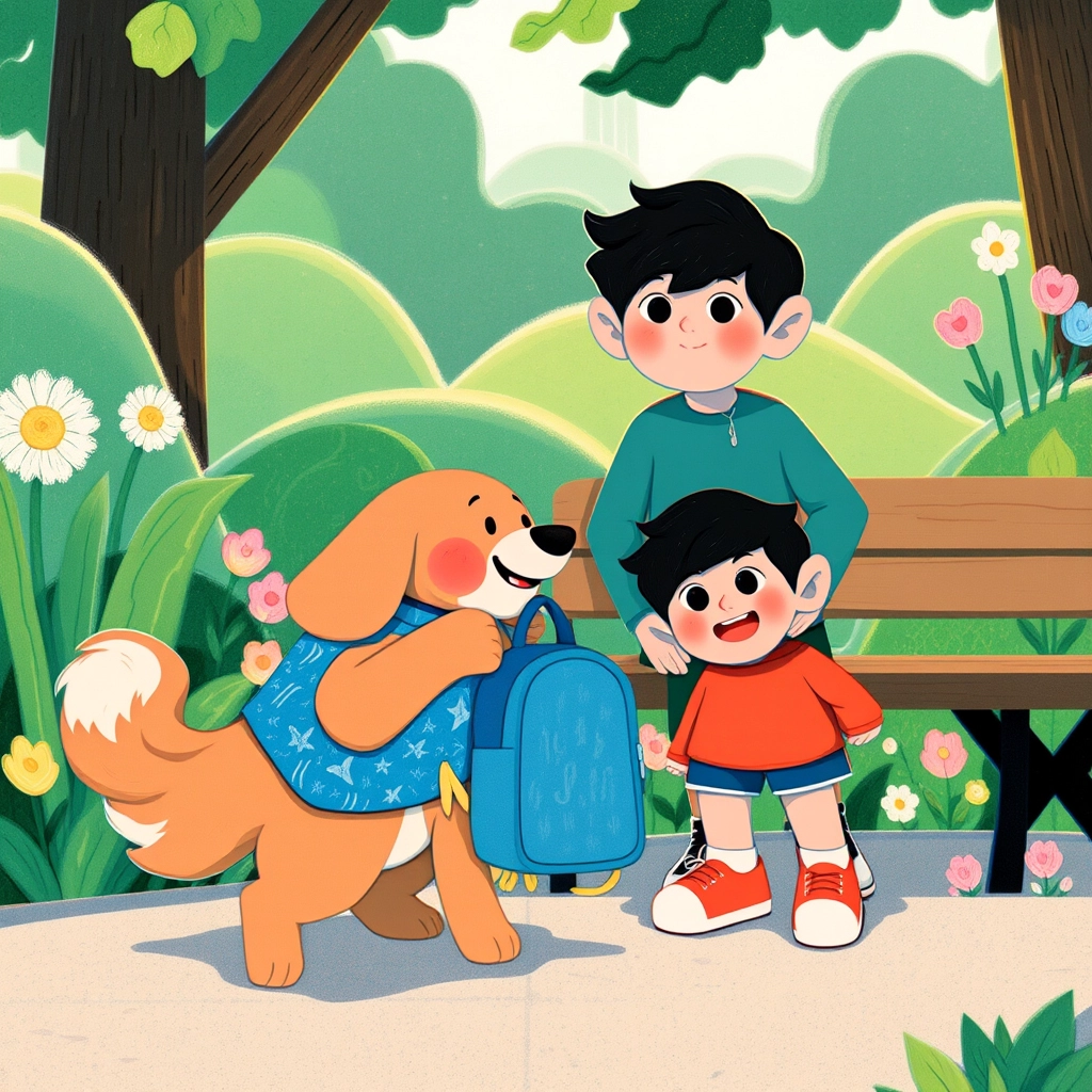 [Joy](LGKKDMY5) wasn’t just about play, though. He was very smart and trained too! When [Aryash](Y29KFJTX) needed help reaching his backpack near the bench, [Joy](LGKKDMY5) pulled it over using his trained skills.
