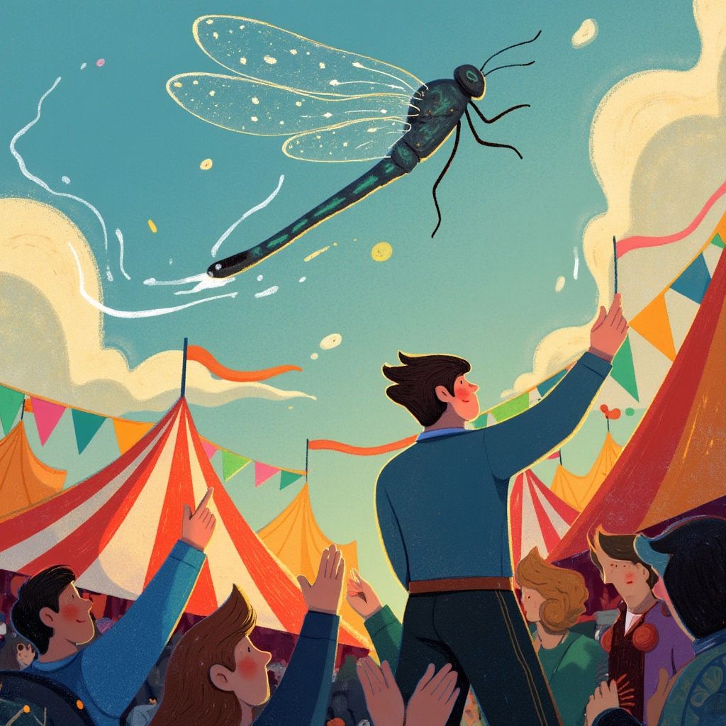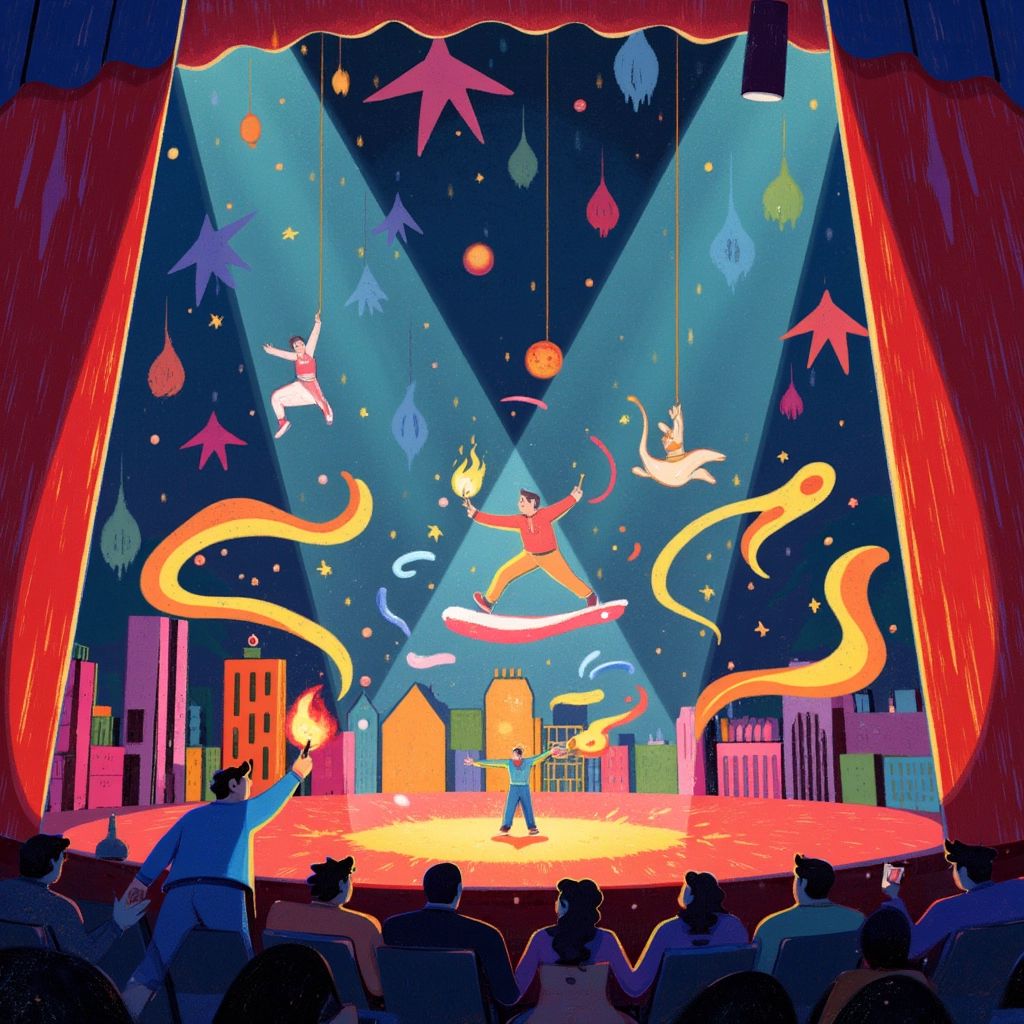 Inside, the tent was even more magical. There were acrobats twirling in mid-air, defying gravity like dandelion seeds on a breeze. Beneath them, a juggler balanced flaming torches that changed colors as they flew.