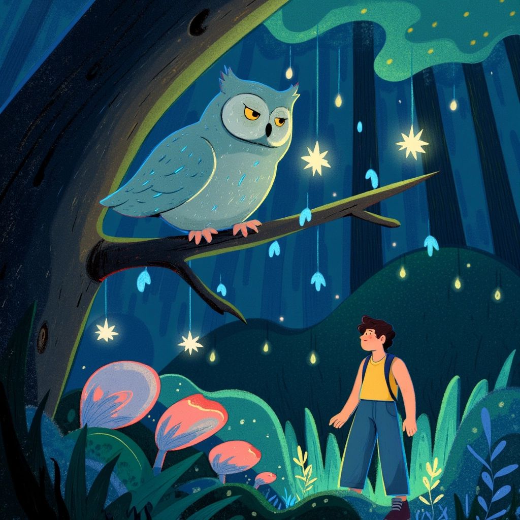The forest was filled with magical creatures. [Justin](2BH3PG3L), full of wonder, met an owl with shimmering silver feathers and eyes like sapphires. 'Welcome, seeker of the feather,' hooted the owl. 'To find your prize, remember to keep an open mind and follow the sparkles of light.'