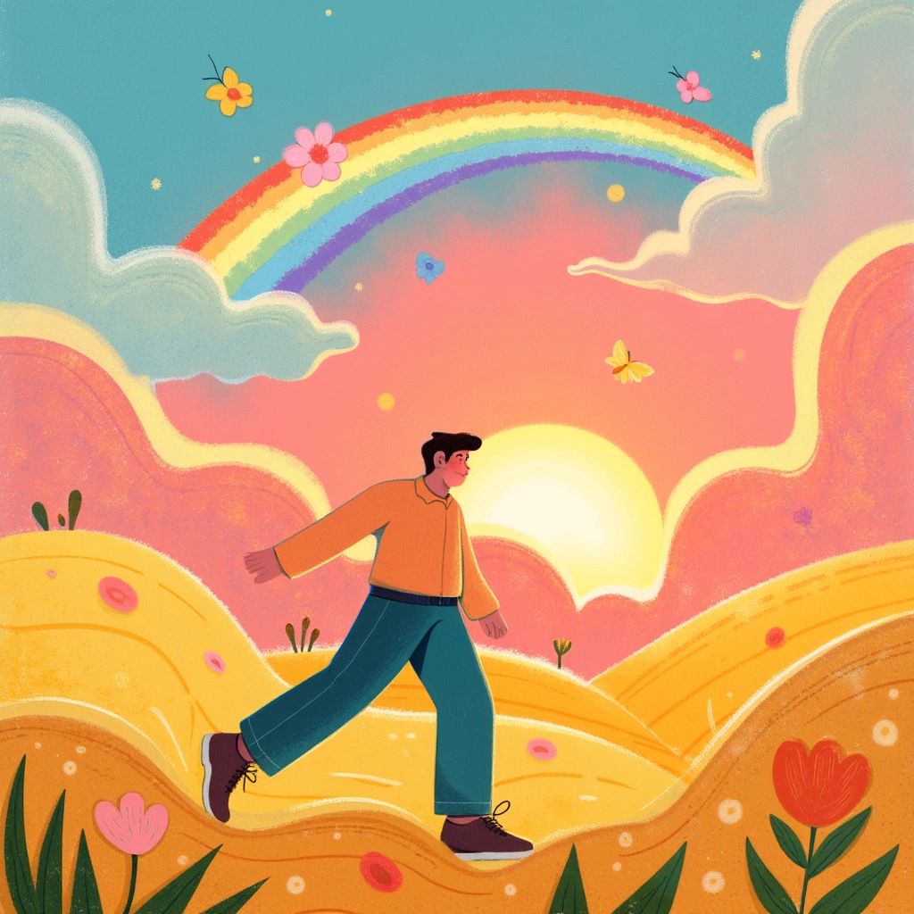 As [Justin](2BH3PG3L) strolled through the fields, he suddenly noticed an unusual sparkle in the sky. It was a rainbow, more vibrant and colorful than any he had ever seen. Intrigued, he decided to follow it.