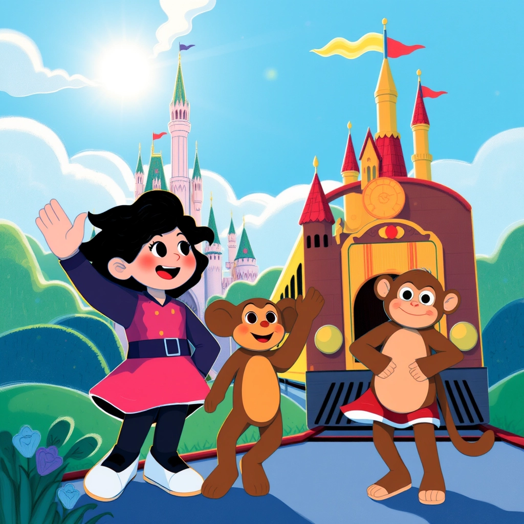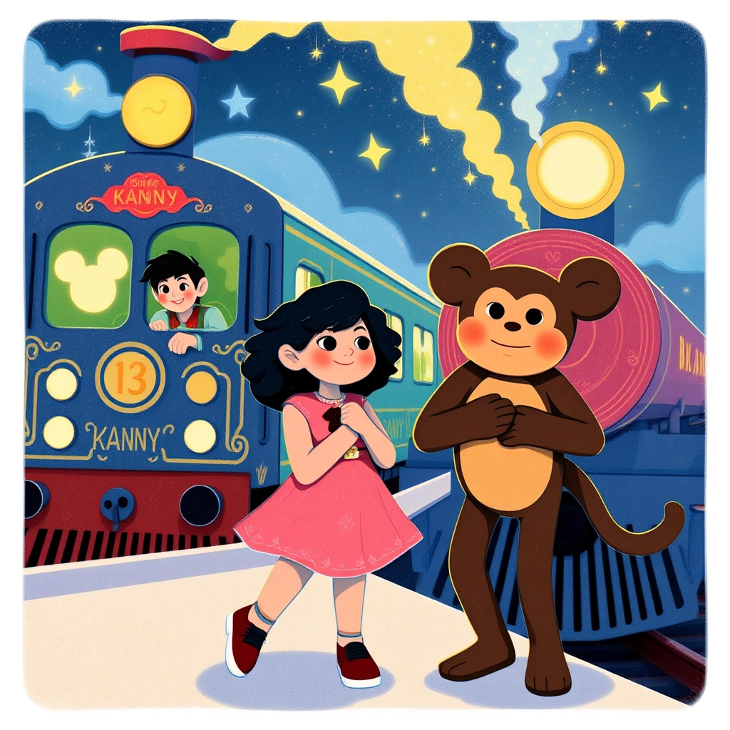 Before they knew it, the magical train arrived to take them back home. [Kanz](NJYVY2QV) waved goodbye to the castle, Mickey, and all the fun they had. 'Until next time!' she said happily.