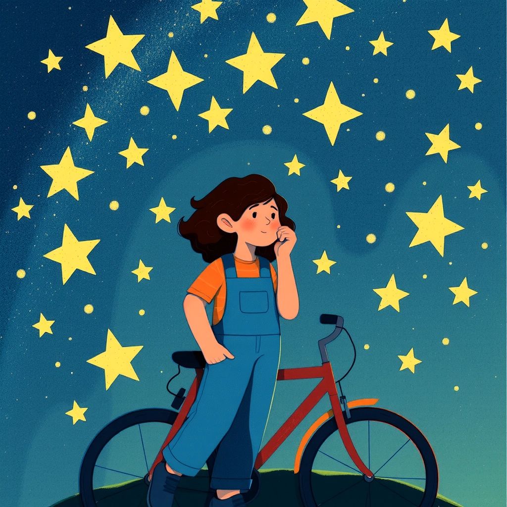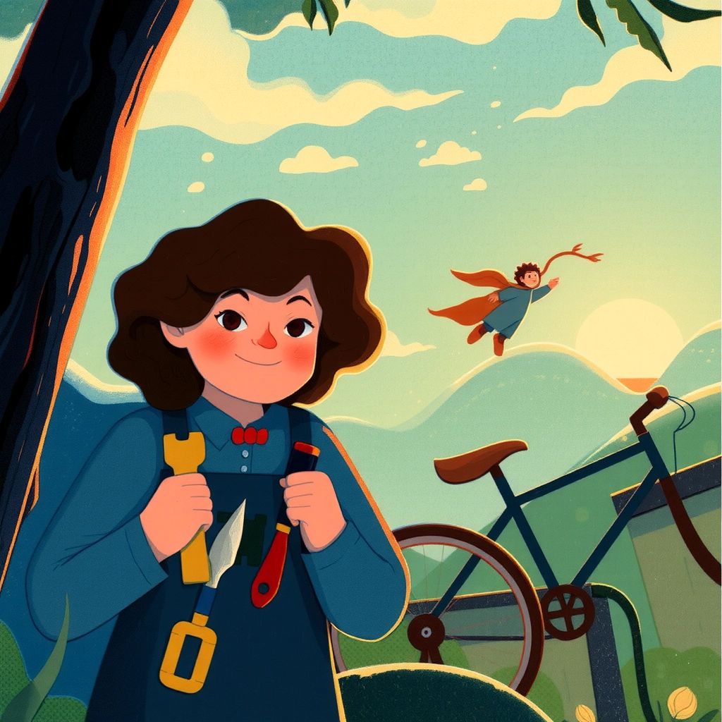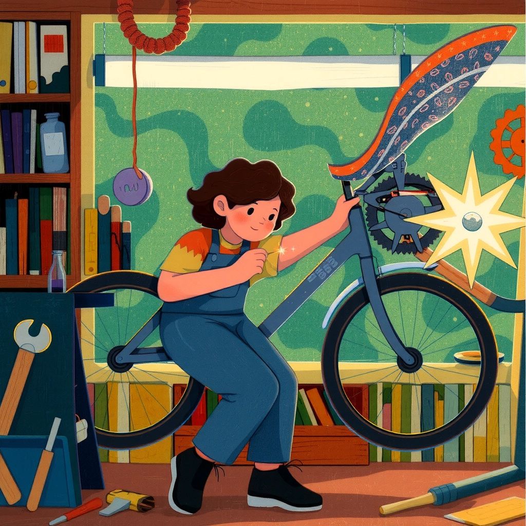One day, she decided to build something extraordinary. She imagined a bicycle that could fly! She worked day and night, adding wings and an engine to her old bicycle.