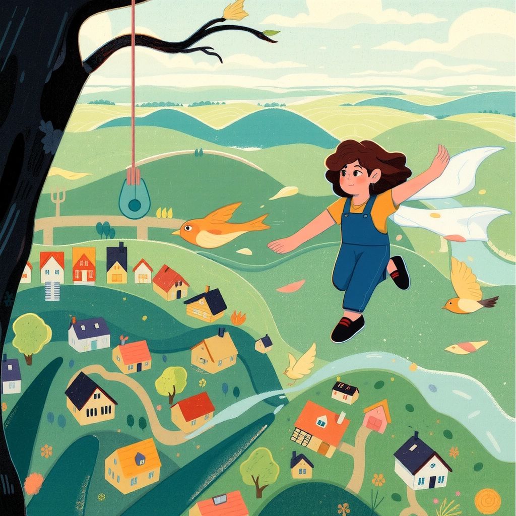 She soared above her town, waving at the tiny houses below. The world looked different from above, full of possibilities and endless adventures.