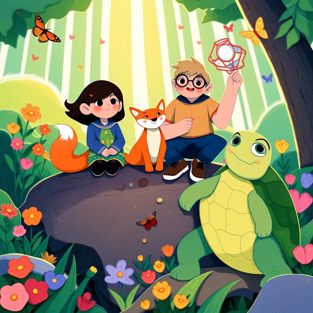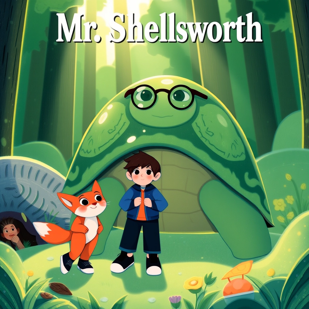 As they walked further, they met a wise old turtle named [Mr. Shellsworth](QRK5CNM9). He was green with a shiny patterned shell and thick glasses on his nose. 'Hello, travelers! Where are you going?' he asked kindly.