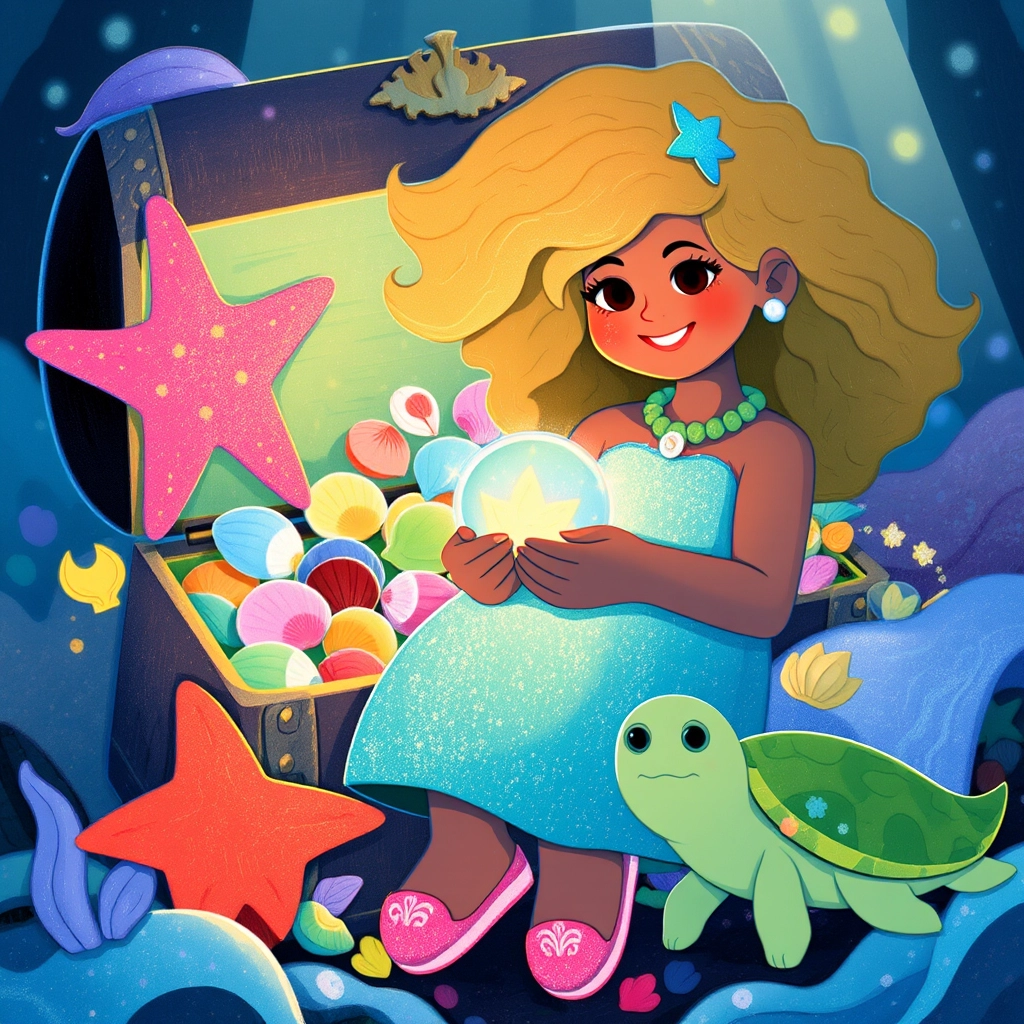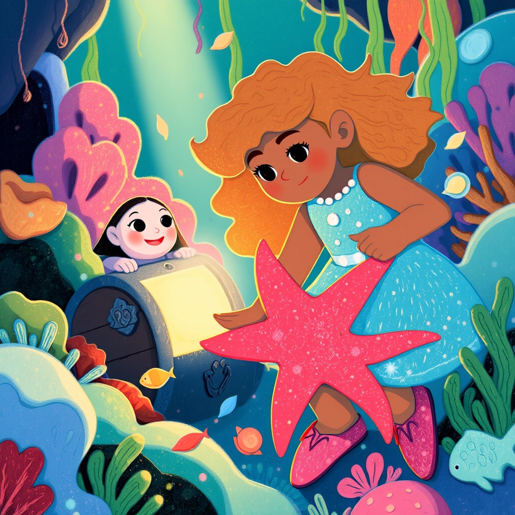 She called her friends—[Bubbles](G7SW9YB2) the Fish, [Tina](QLHQM499) the Turtle, and of course, [Starry](7MXNLPK4). Together, they pulled and tugged until—POP!—the treasure chest opened.