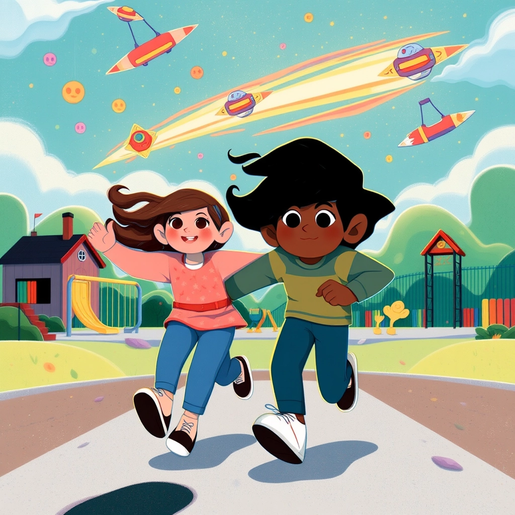 The two zoomed across the playground, pretending to dodge space rocks and alien invaders. 'Incoming asteroid! Quick, zig-zag!' [Faheem](D45WYSCQ) shouted, leading the way. [Hana](TLTF3P9Q) laughed as she followed, now glowing with excitement.