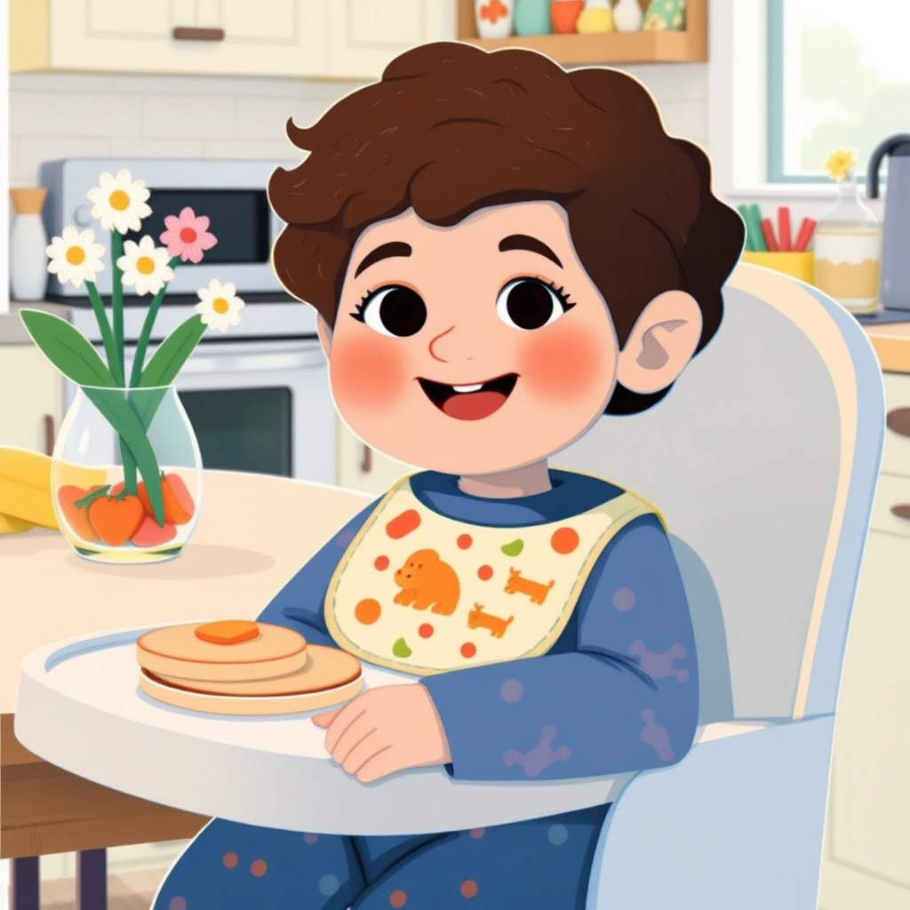 Today is no different. [Knoa](G4CHCFCL) beams as he sits in his high chair, enjoying a breakfast of soft pancakes and tiny fruit pieces. His puppy-shaped bib keeps him clean as he giggles with every bite.