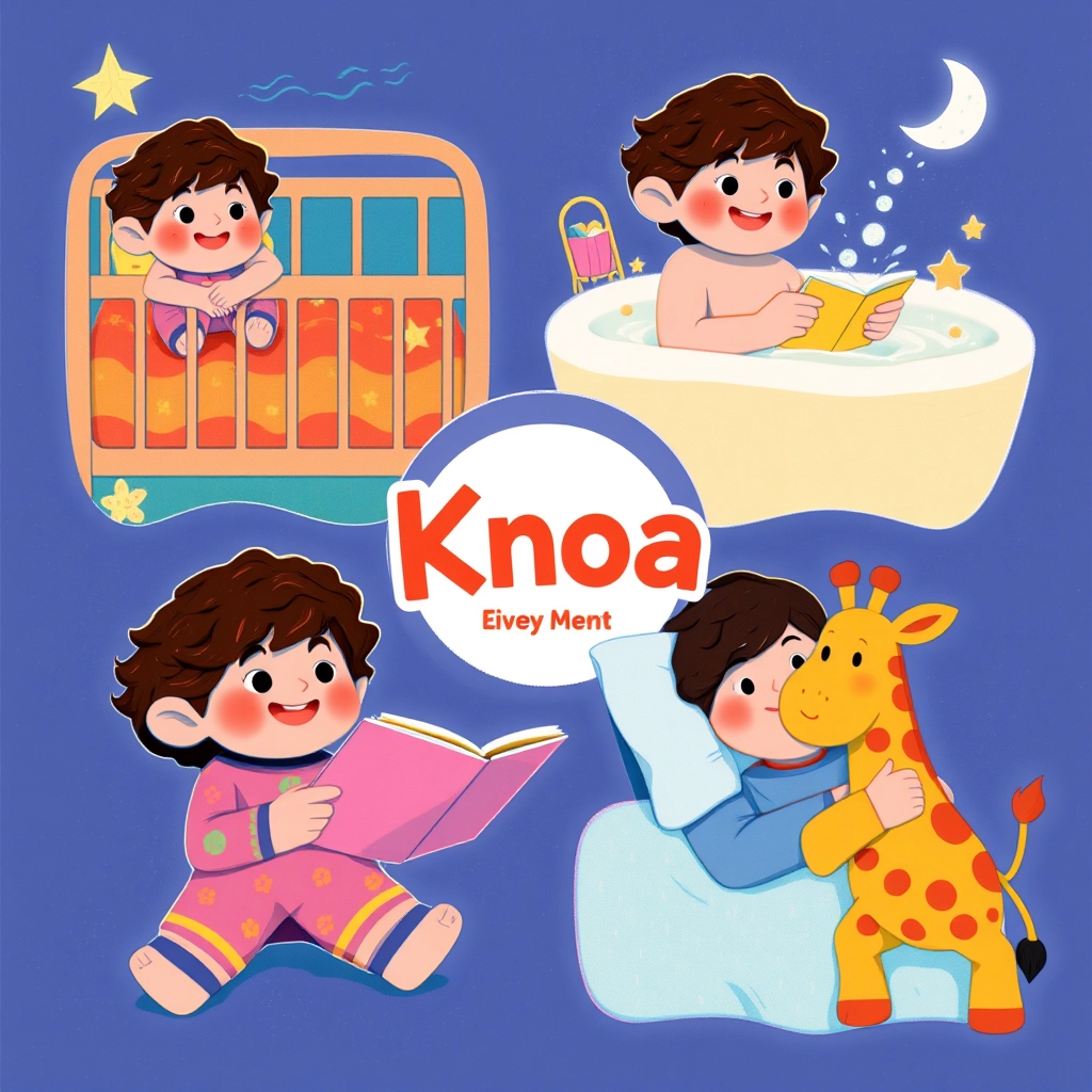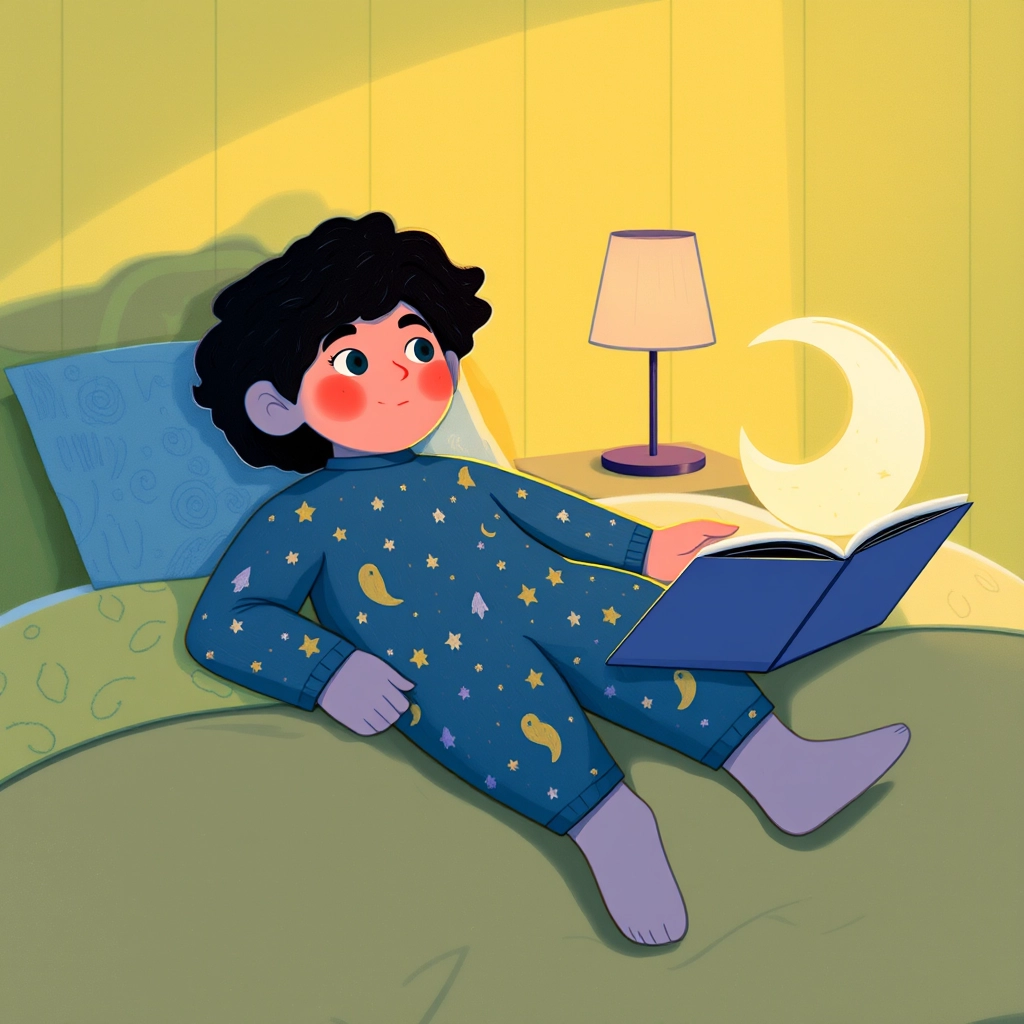 Finally, [Knoa](G4CHCFCL) changes into his cozy pajamas with moon and star patterns. His mom reads him a bedtime story as he hugs his stuffed giraffe tightly, listening intently.