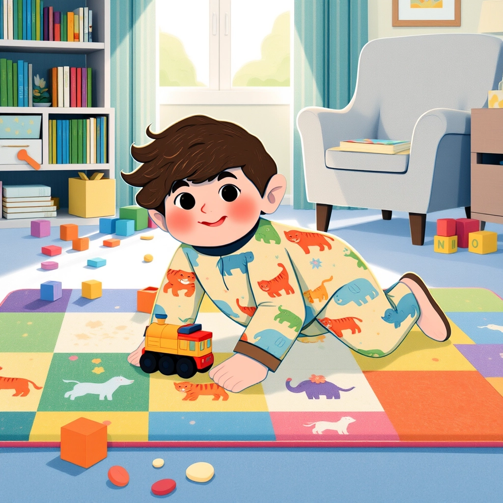 After his bath, [Knoa](G4CHCFCL) gets dressed in another playful onesie with little animals on it. He looks like a tiny explorer as he crawls around with his toy train in hand.