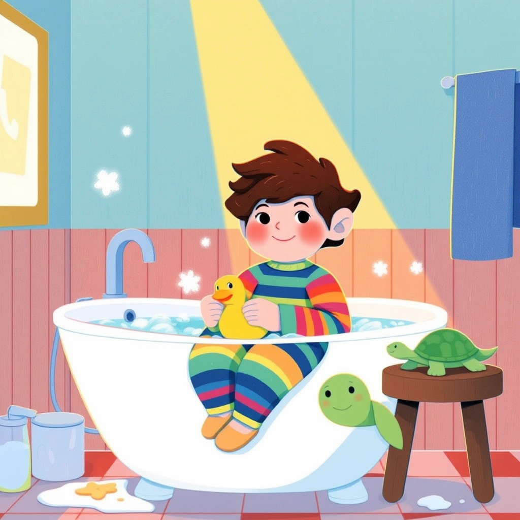 Bath time is always an adventure! [Knoa](G4CHCFCL) splashes around in his bubbly tub, laughing as his rubber ducky floats by. He loves the warm water and the squishy foam around him.