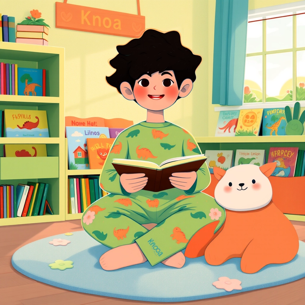 Later, [Knoa](G4CHCFCL) visits his favorite shelf filled with colorful board books. ‘Storytime!’ his eyes say as he picks up one with a sparkling cover. He enjoys flipping through the pages and pointing at the pictures of animals.
