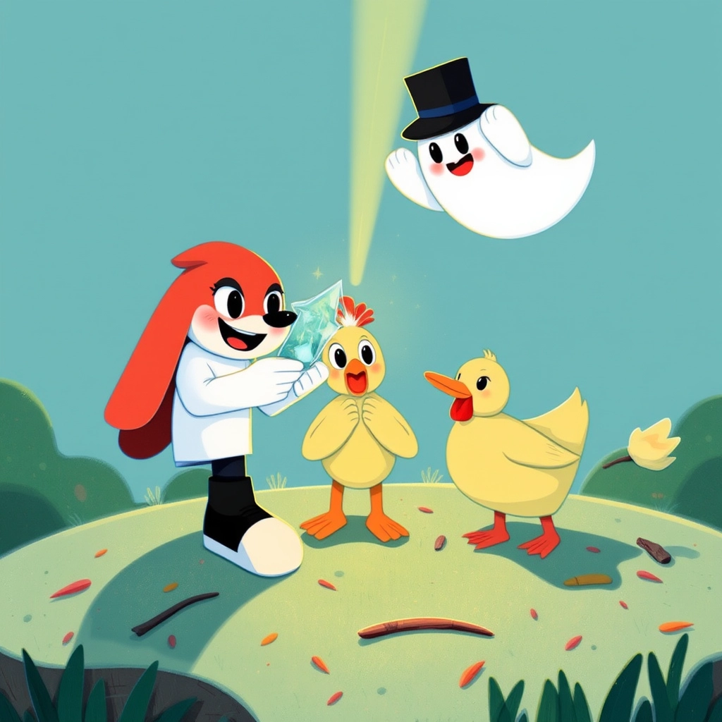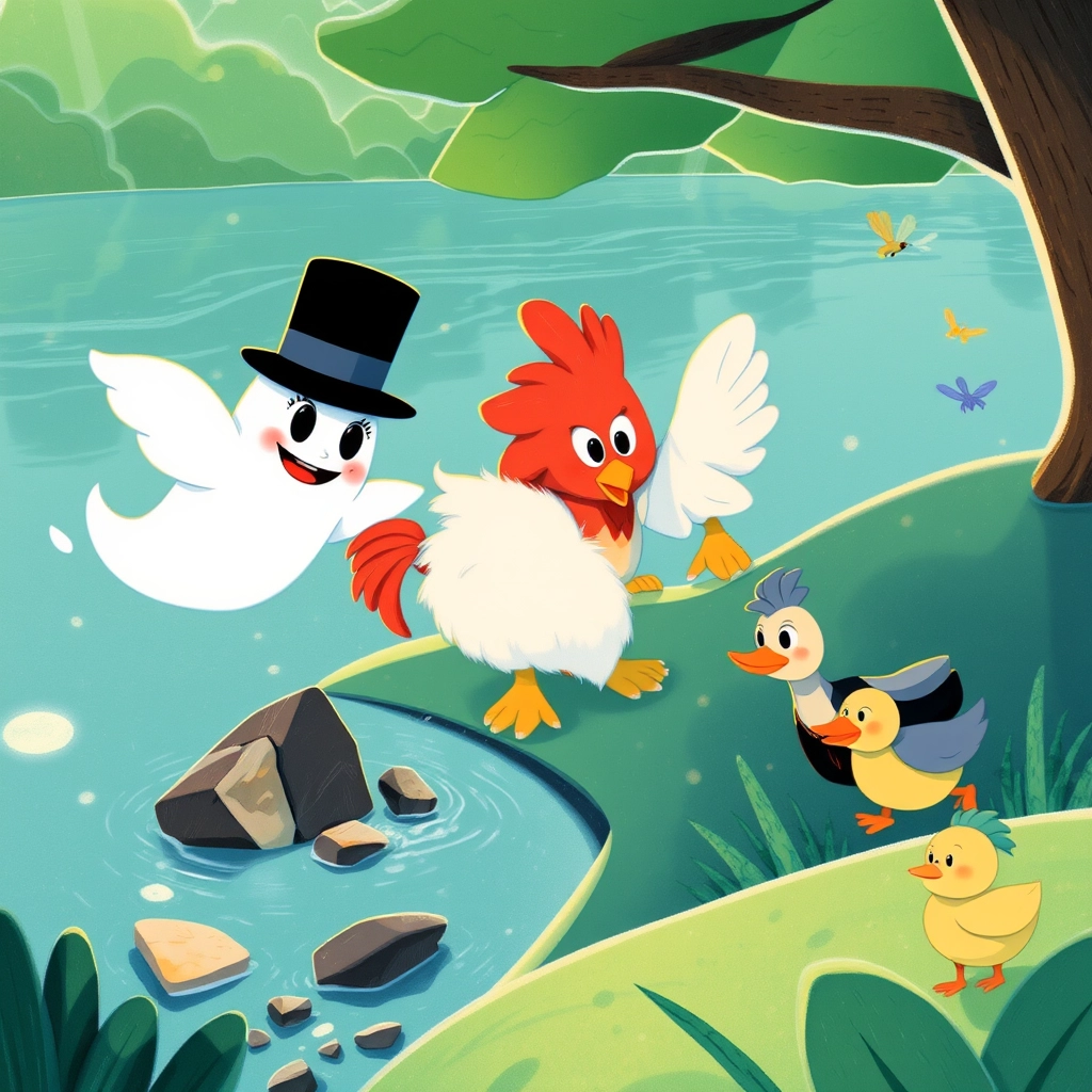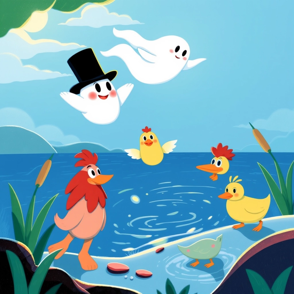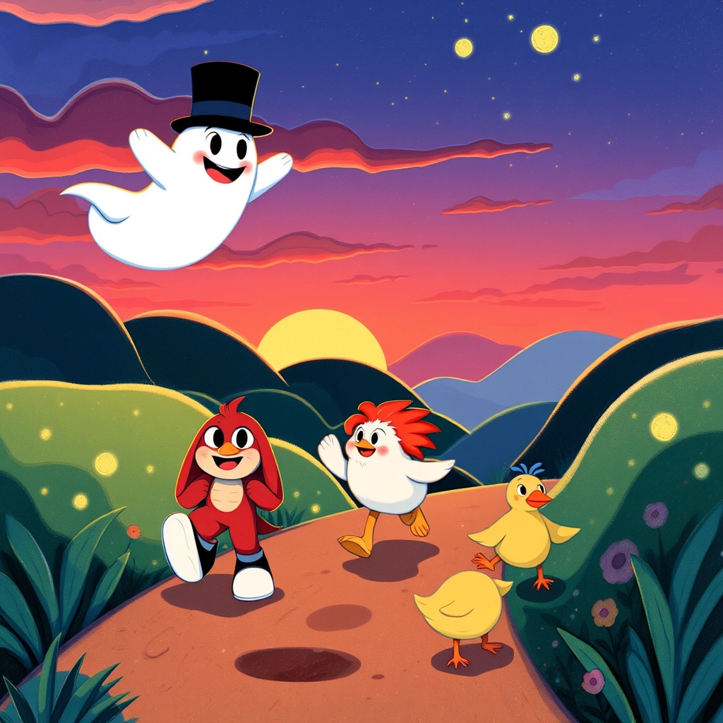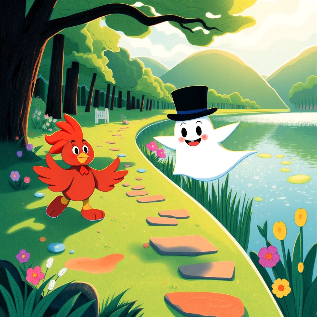 Once upon a time, a friendly ghost named [Knuckles](JBB26P76) and his best friend [Rodney](K2VZ75LR) the chicken went for a walk along the shimmering blue lake. The air was filled with the chirping of crickets and the rustling of leaves. [Rodney](K2VZ75LR) clucked happily, flapping his wings as [Knuckles](JBB26P76) floated beside him with a big grin. They loved exploring nature together!