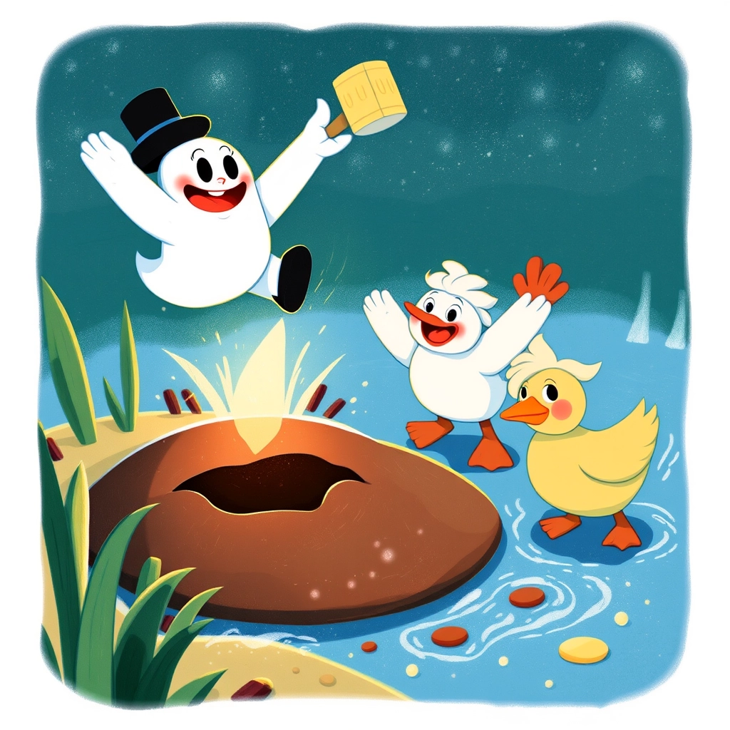 Hurriedly, the trio reached the water's edge. A shiny hammer was resting halfway in the mud surrounded by reeds! 'Quack, there it is!' [Doosh](PDDCNYH9) quacked excitedly. Together, they carefully retrieved the hammer and cheered for their teamwork.