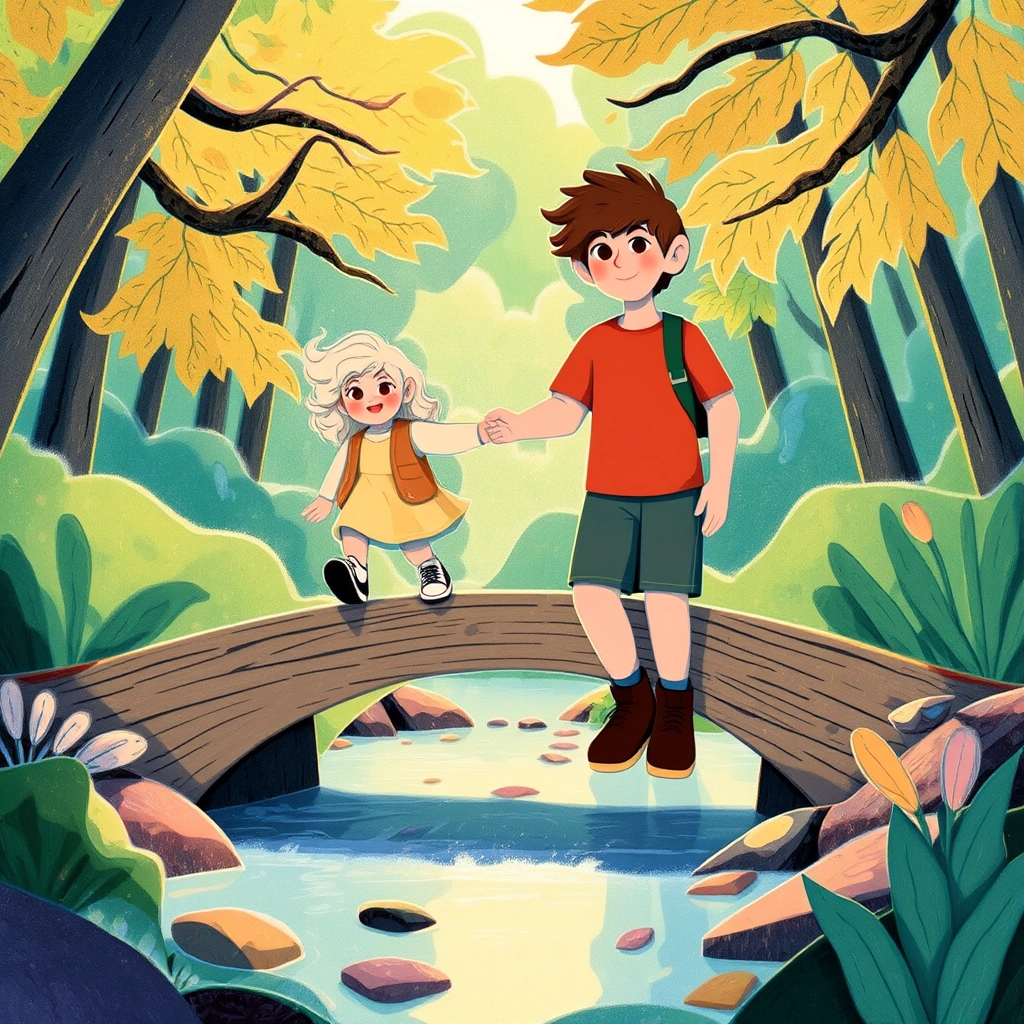 Their first challenge was crossing an old wooden bridge that creaked and swayed with every step. [Léa](RV7X4MXP) was nervous, but [Léo](SV9V6D99) held her hand and said, 'Don't worry, [Léa](RV7X4MXP). Together, we are stronger.' Encouraged by [Léo](SV9V6D99)’s words, [Léa](RV7X4MXP) stepped forward, and both friends crossed the bridge safely.