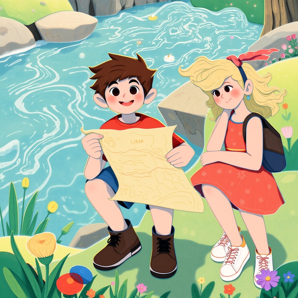 In a small village surrounded by lush forests, two inseparable friends, [Léo](SV9V6D99) and [Léa](RV7X4MXP), spent their days playing and exploring. One day, while playing by the river, they discovered an old treasure map hidden under a rock. With their eyes shining with excitement, they decided to go on an adventure to find the hidden treasure!