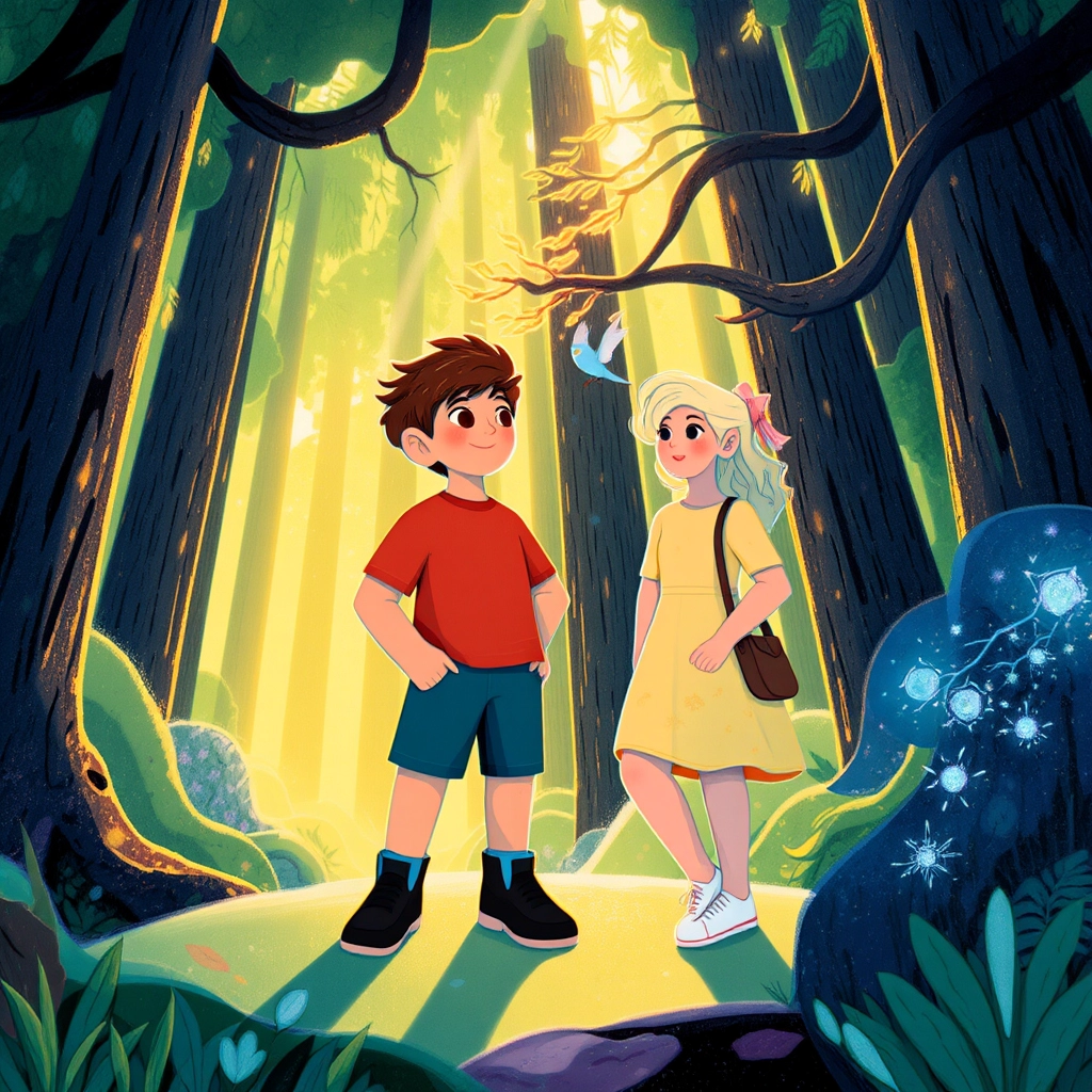 Next, the map led them into an enchanted forest, where the trees hummed and whispered secrets. As they explored, they met a wise little blue bird who told them, 'To find the treasure, you must believe in yourselves. The treasure is hidden for those who dare to dream.' These words gave [Léo](SV9V6D99) and [Léa](RV7X4MXP) the courage to continue.